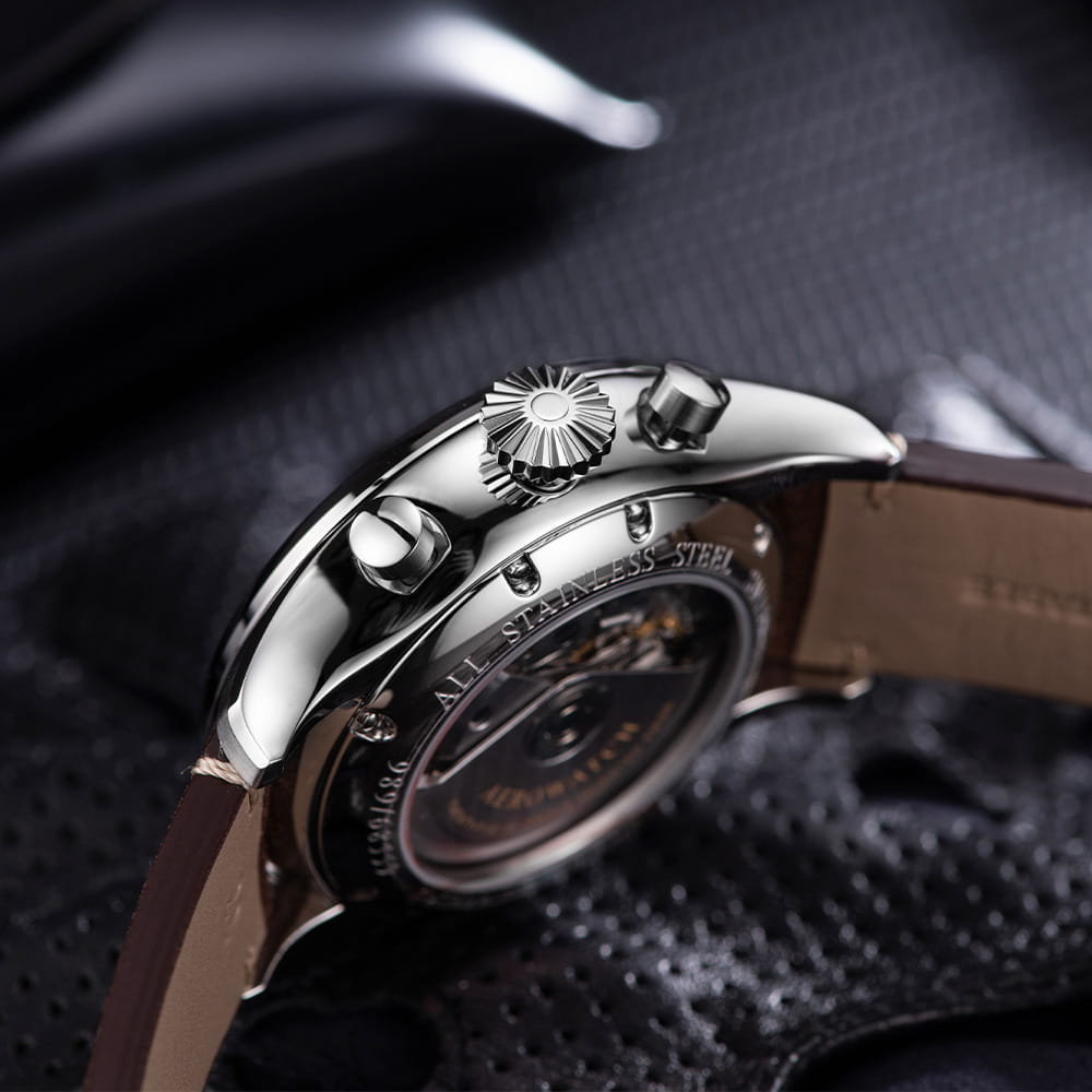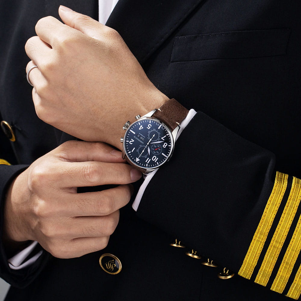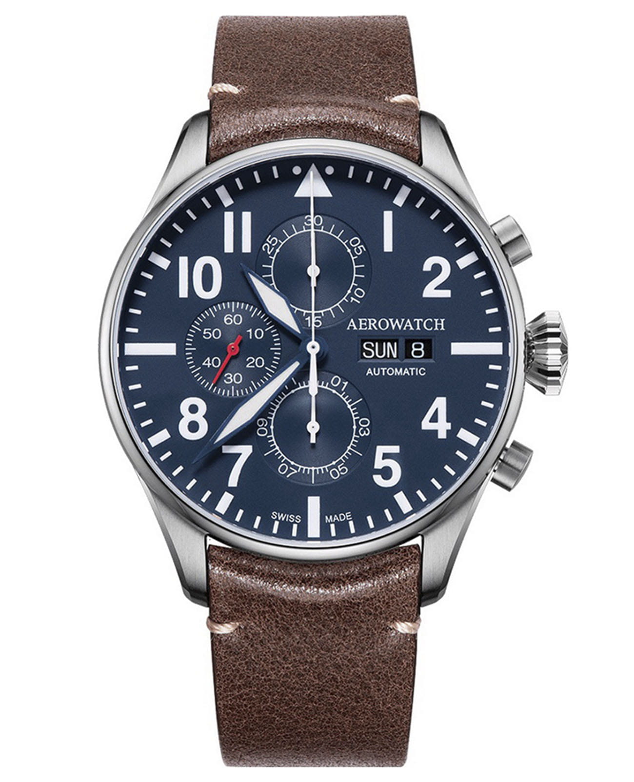 Мужские механические швейцарские часы-хронографХронографФункция позволяет измерять отрезки времени с особой точностью: часы, минуты, секунды. Верным признаком хронографа является наличие на циферблате 3 дополнительных окошек-счётчиков. с автоподзаводом Aerowatch Les Grandes Classiques Pilot 61989 AA05. Сапфировое стеклоСапфировое стеклоПрочный и надёжный материал из кристалла сапфира синтетического происхождения, характеризующийся особой твёрдостью и устойчивостью к царапинам и повреждениям. устойчивое к появлению царапин, обладающее высокой прозрачностью. Корпус изготовлен из нержавеющей стали. В часах установлен калибр Valjoux 7750 с 25ю камнями, доработанный мастерами Aerowatch. Механизм декорированый узором «côtes de Genève» и воронеными винтами имеет запас хода 42 часа. Циферблат украшают стрелки люминесцентным покрытиемЛюминесцентное покрытиеПозволяет считывать показания времени в темноте. Производители наносят на стрелки, часовые индексы, безель или поверхность циферблата светонакопительный состав, дающий холодное свечение., окошко даты и дня недели в положении 3 часов. Класс водозащиты: 50 метров, позволит защитить корпус от случайных брызг или капель дождя. Кожаный ремешок на стандартной застёжке.