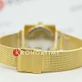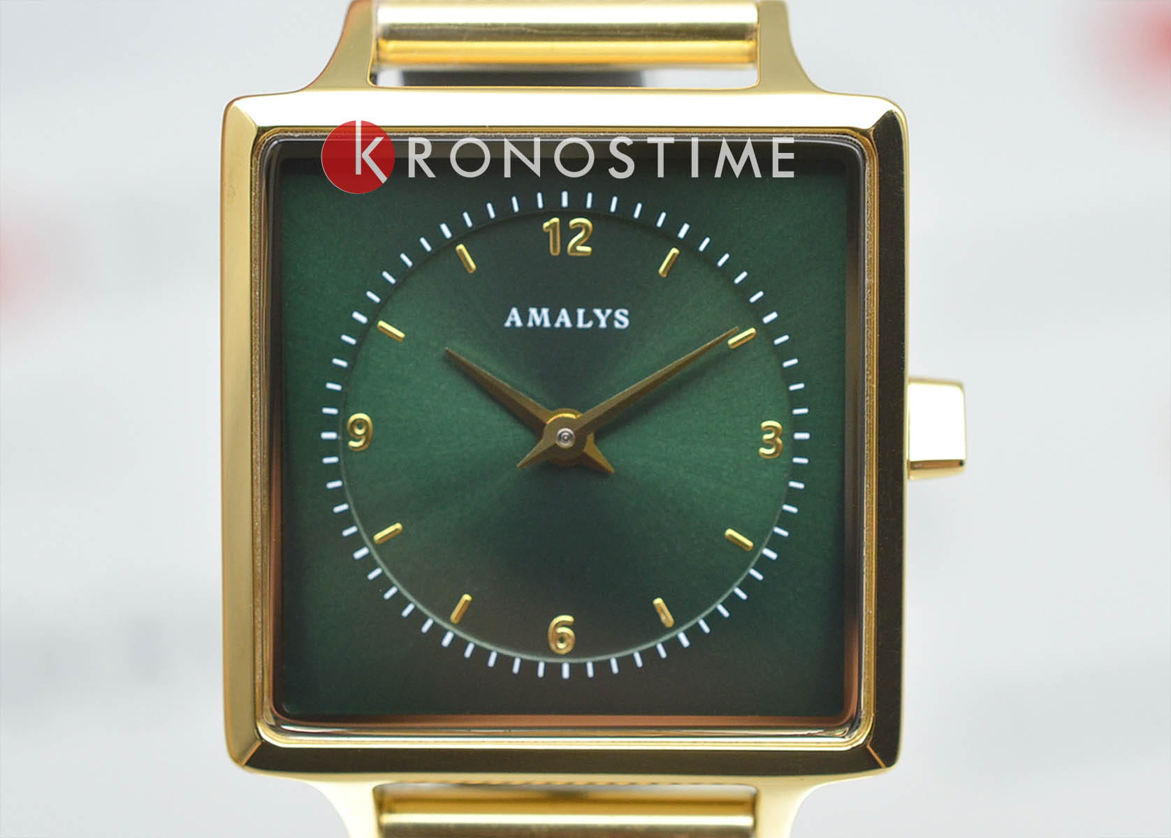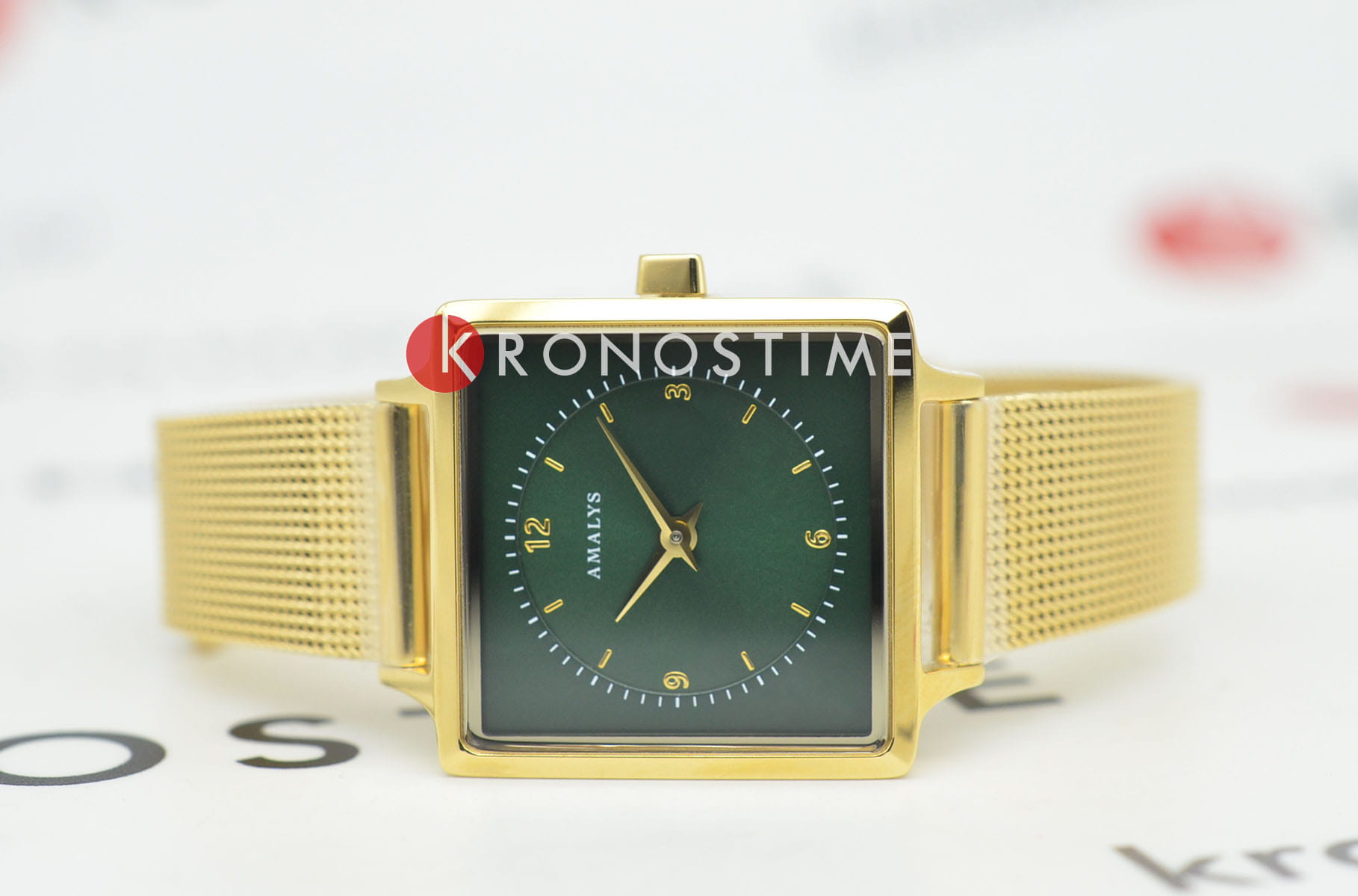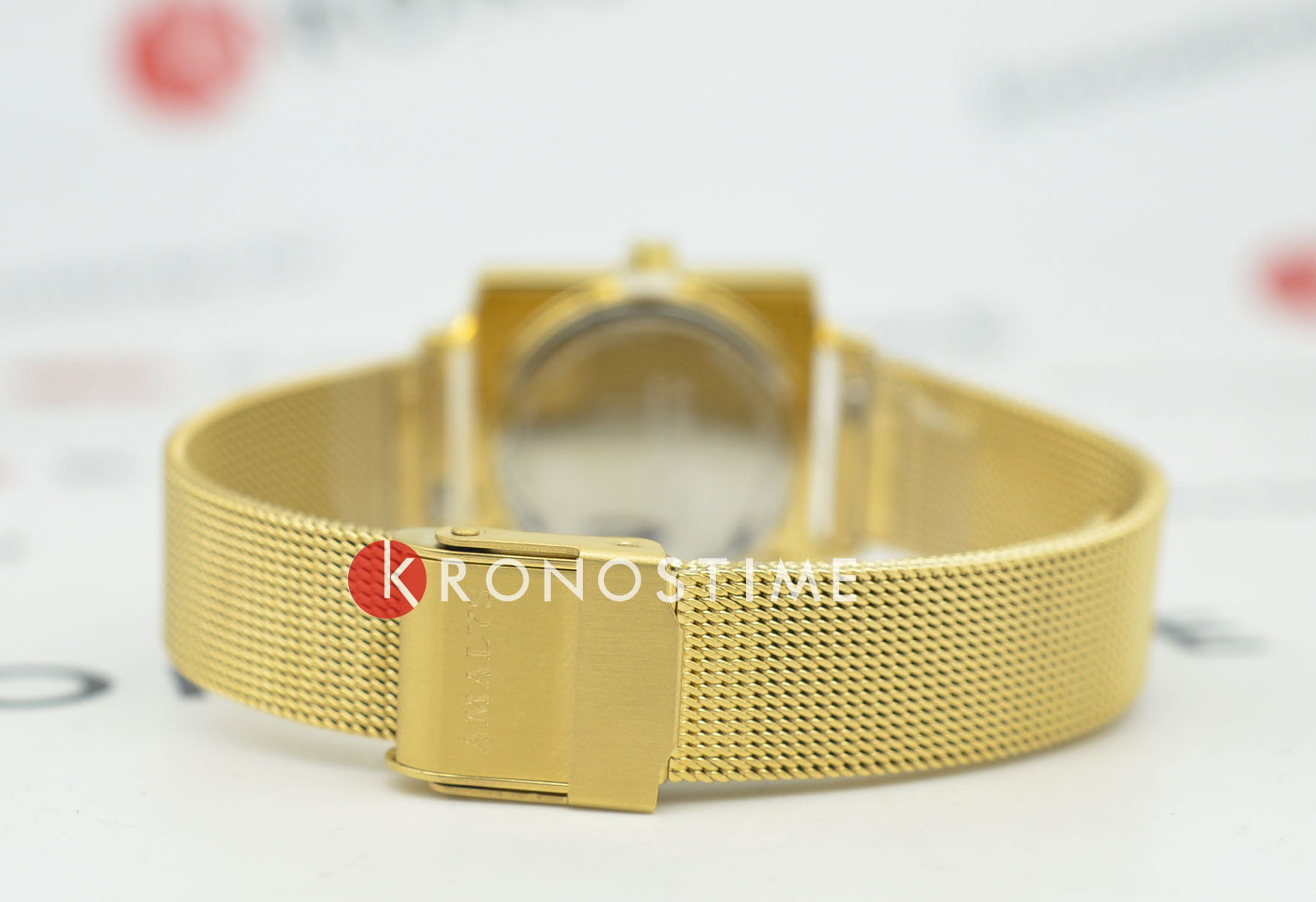 Amalys AMW-136 — женская модель с утончённой минималистичной эстетикой, где квадратный корпус с PVD-покрытиемPVDУльтратонкое покрытие наносится в технике вакуумного напыления, сочетает в себе нитрид титана особой прочности со слоем золота или оксида хрома. Несёт в себе декоративную или защитную функцию. размером 25 мм подчёркивает современный характер и чистоту линий. Механизм — точный кварцевый, обеспечивающий стабильный ход и надёжность в повседневном использовании. Поверхность циферблата оформлена в лаконичном стиле с тонкими метками и стрелками, создающими гармонию и визуальную лёгкость. Защитную функцию выполняет минеральное стеклоМинеральное стеклоМинеральное стекло представляет собой искусственно выращенный минерал кварца. Такое стекло отличается особой устойчивостью к повреждениям и царапинам. Уступает по некоторым качествам сапфировому стеклу., устойчивое к механическим воздействиям и сохраняющее читаемость при ежедневной носке. Браслет с PVD-покрытиемPVDУльтратонкое покрытие наносится в технике вакуумного напыления, сочетает в себе нитрид титана особой прочности со слоем золота или оксида хрома. Несёт в себе декоративную или защитную функцию. выполнен в виде «миланской сетки» шириной 14 мм, оснащён раскладным замкомРаскладной замокДанный вариант застежки используется только на часах с металлическим браслетом. Отличительная особенность такого крепления в том, что длина браслета становится универсальной и вы можете самостоятельно отрегулировать нужный вам размер – застежка просто двигается по браслету часов., его гибкая структура обеспечивает комфортное прилегание к запястью и визуальную утончённость. Единство корпуса и браслета создаёт целостный образ, а изысканная простота дизайна делает модель универсальной — она одинаково уместна и в деловой обстановке, и в повседневных сочетаниях.