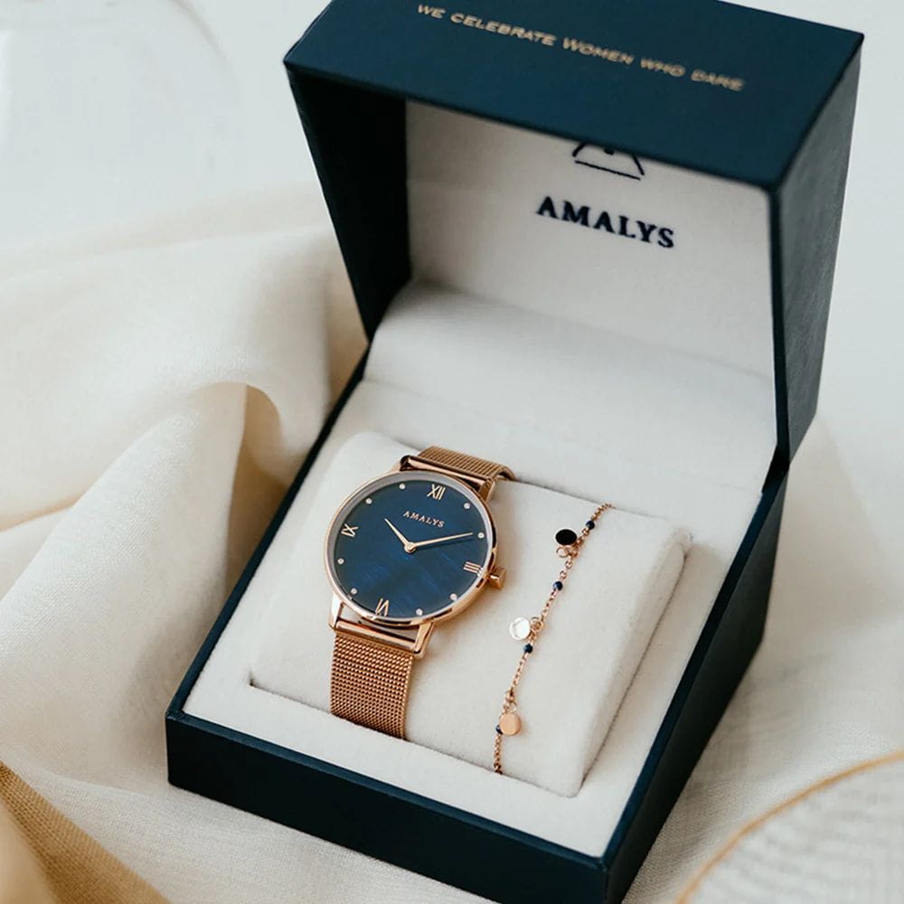 Amalys AMW-191 — женский набор, включающий часы и браслет, выполненный в едином элегантном стиле. Круглый корпус диаметром 33 мм изготовлен из нержавеющей стали с PVDPVDУльтратонкое покрытие наносится в технике вакуумного напыления, сочетает в себе нитрид титана особой прочности со слоем золота или оксида хрома. Несёт в себе декоративную или защитную функцию.-покрытием тёплого золотистого оттенка, что подчёркивает изысканный характер модели. Защитную функцию выполняет сапфировое стеклоСапфировое стеклоПрочный и надёжный материал из кристалла сапфира синтетического происхождения, характеризующийся особой твёрдостью и устойчивостью к царапинам и повреждениям., стойкое к царапинам и сохраняющее прозрачность. Механизм — кварцевый, обеспечивающий точность хода и удобство в использовании. Водозащита 3 ATM защищает от случайных брызг и дождя. Циферблат оформлен в минималистичном стиле с тонкими метками и изящными стрелками, подчёркивающими женственный образ. Стальной браслет миланского плетения с PVDPVDУльтратонкое покрытие наносится в технике вакуумного напыления, сочетает в себе нитрид титана особой прочности со слоем золота или оксида хрома. Несёт в себе декоративную или защитную функцию.-покрытием на раскладном замкеРаскладной замокДанный вариант застежки используется только на часах с металлическим браслетом. Отличительная особенность такого крепления в том, что длина браслета становится универсальной и вы можете самостоятельно отрегулировать нужный вам размер – застежка просто двигается по браслету часов. мягко облегает запястье и гармонично сочетается с корпусом. Дополняющий набор браслет усиливает впечатление цельности и придаёт образу завершённость.