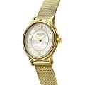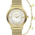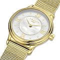 Amalys AMW-196 — женский набор, включающий часы и браслет, выполненный в гармоничном стиле. Круглый корпус диаметром 28 мм изготовлен из нержавеющей стали с PVDPVDУльтратонкое покрытие наносится в технике вакуумного напыления, сочетает в себе нитрид титана особой прочности со слоем золота или оксида хрома. Несёт в себе декоративную или защитную функцию.-покрытием тёплого золотистого оттенка, а браслет типа «миланская сетка» шириной 14 мм обеспечивает комфортное прилегание и подчёркивает изящный образ. Защитную функцию выполняет сапфировое стеклоСапфировое стеклоПрочный и надёжный материал из кристалла сапфира синтетического происхождения, характеризующийся особой твёрдостью и устойчивостью к царапинам и повреждениям., устойчивое к царапинам и сохраняющее прозрачность. Механизм — кварцевый, надёжный и точный. Браслет с PVDPVDУльтратонкое покрытие наносится в технике вакуумного напыления, сочетает в себе нитрид титана особой прочности со слоем золота или оксида хрома. Несёт в себе декоративную или защитную функцию.-покрытием снабжён раскладным замкомРаскладной замокДанный вариант застежки используется только на часах с металлическим браслетом. Отличительная особенность такого крепления в том, что длина браслета становится универсальной и вы можете самостоятельно отрегулировать нужный вам размер – застежка просто двигается по браслету часов., что делает ношение удобным и безопасным. Водозащита 5 ATM предохраняет модель от случайных брызг и дождя. Циферблат с римскими индексами и утончённым декоративным узором придаёт часам элегантность, а комплектный браслет завершает цельный и женственный образ.