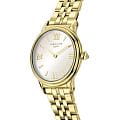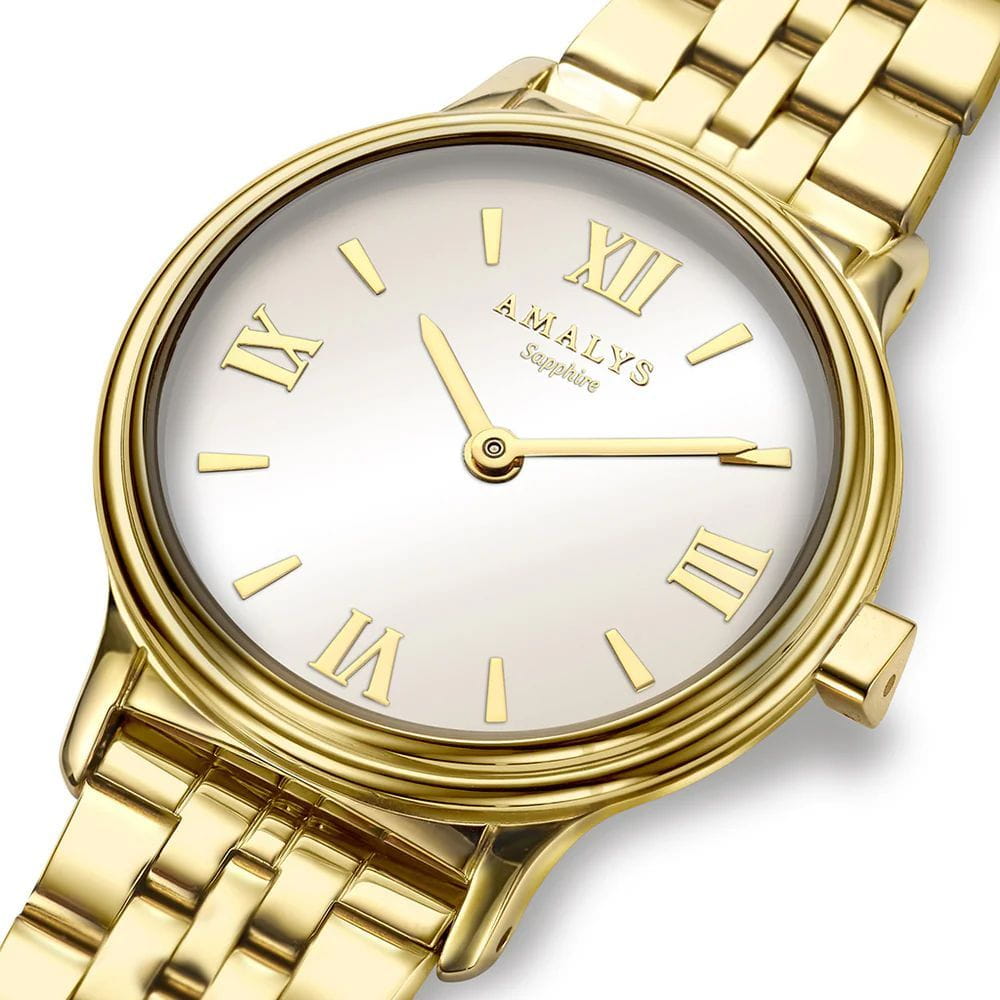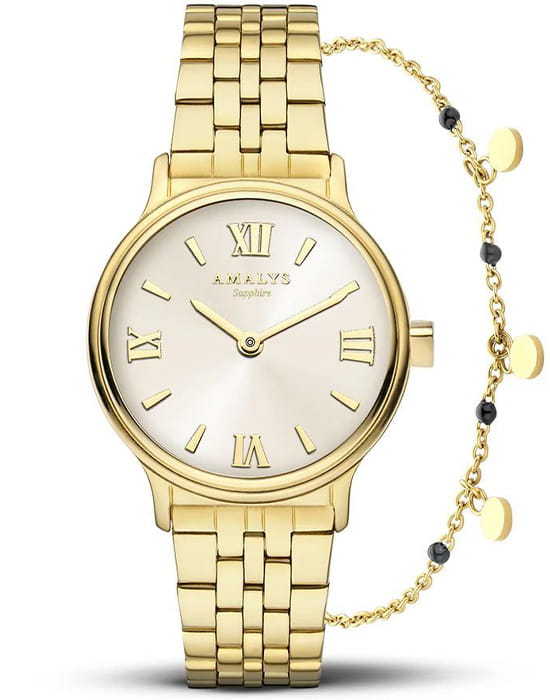 Amalys AMW-199 — женский набор, включающий часы и браслет, выполненный в гармоничном стиле. Круглый корпус диаметром 28 мм изготовлен из нержавеющей стали с PVDPVDУльтратонкое покрытие наносится в технике вакуумного напыления, сочетает в себе нитрид титана особой прочности со слоем золота или оксида хрома. Несёт в себе декоративную или защитную функцию.-покрытием тёплого золотистого оттенка, а браслет шириной 14 мм обеспечивает комфортное прилегание и подчёркивает изящный образ. Защитную функцию выполняет сапфировое стеклоСапфировое стеклоПрочный и надёжный материал из кристалла сапфира синтетического происхождения, характеризующийся особой твёрдостью и устойчивостью к царапинам и повреждениям., устойчивое к царапинам и сохраняющее прозрачность. Механизм — кварцевый, надёжный и точный. Браслет с PVDPVDУльтратонкое покрытие наносится в технике вакуумного напыления, сочетает в себе нитрид титана особой прочности со слоем золота или оксида хрома. Несёт в себе декоративную или защитную функцию.-покрытием снабжён раскладным замкомРаскладной замокДанный вариант застежки используется только на часах с металлическим браслетом. Отличительная особенность такого крепления в том, что длина браслета становится универсальной и вы можете самостоятельно отрегулировать нужный вам размер – застежка просто двигается по браслету часов., что делает ношение удобным и безопасным. Водозащита 5 ATM предохраняет модель от случайных брызг и дождя. Циферблат с римскими индексами и утончённым декоративным узором придаёт часам элегантность, а комплектный браслет завершает цельный и женственный образ.