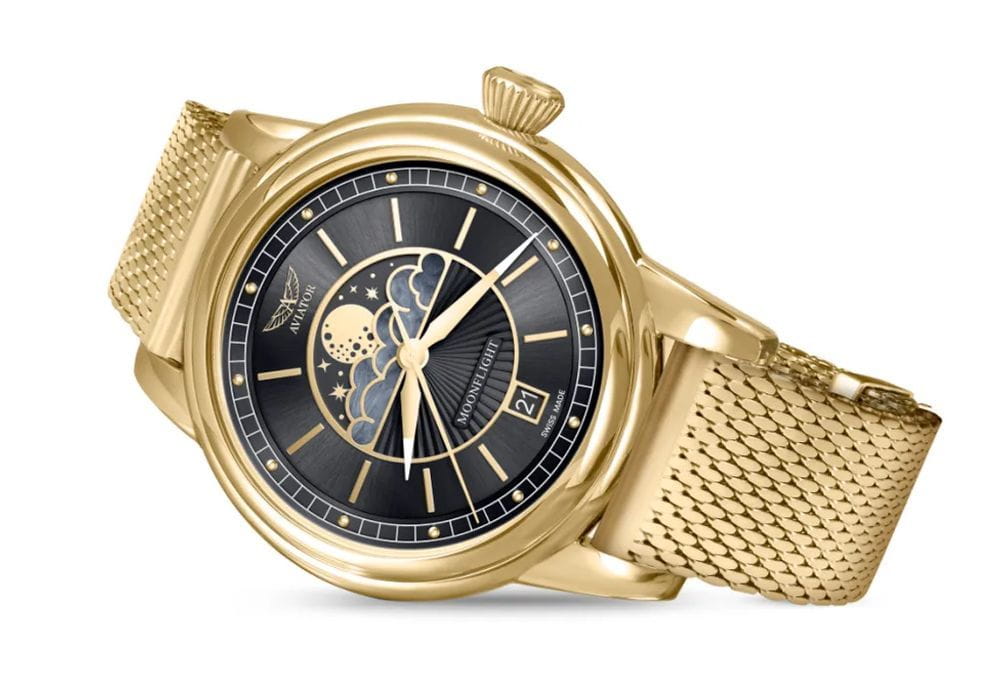 Aviator V.1.33.1.344.5 “Douglas Moonflight” — элегантный дамский швейцарский Moonphase с утончённой авиационной эстетикой. Корпус 36 мм из нержавеющей стали с PVD-покрытиемPVDУльтратонкое покрытие наносится в технике вакуумного напыления, сочетает в себе нитрид титана особой прочности со слоем золота или оксида хрома. Несёт в себе декоративную или защитную функцию. с полированной отделкой обладает компактными пропорциями и удобным литым профилем.