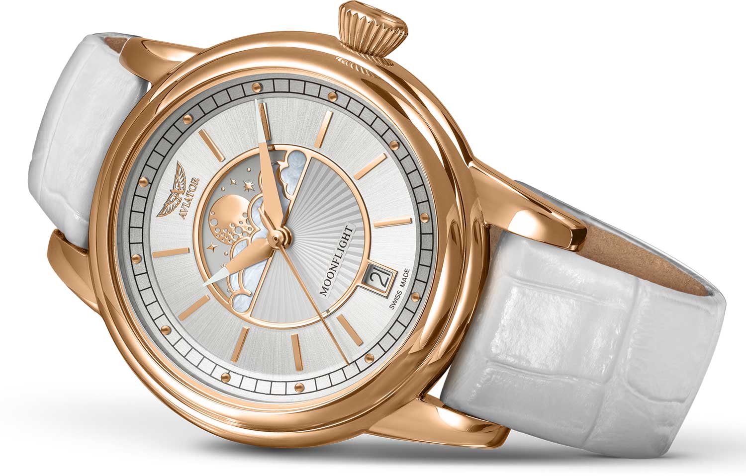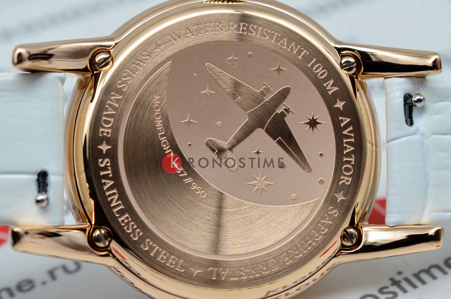 Aviator V.1.33.2.251.4 “Douglas Moonflight” — элегантный дамский швейцарский Moonphase с утончённой авиационной эстетикой. Корпус 36 мм из нержавеющей стали с PVD-покрытиемPVDУльтратонкое покрытие наносится в технике вакуумного напыления, сочетает в себе нитрид титана особой прочности со слоем золота или оксида хрома. Несёт в себе декоративную или защитную функцию. с полированной отделкой обладает компактными пропорциями и удобным литым профилем.