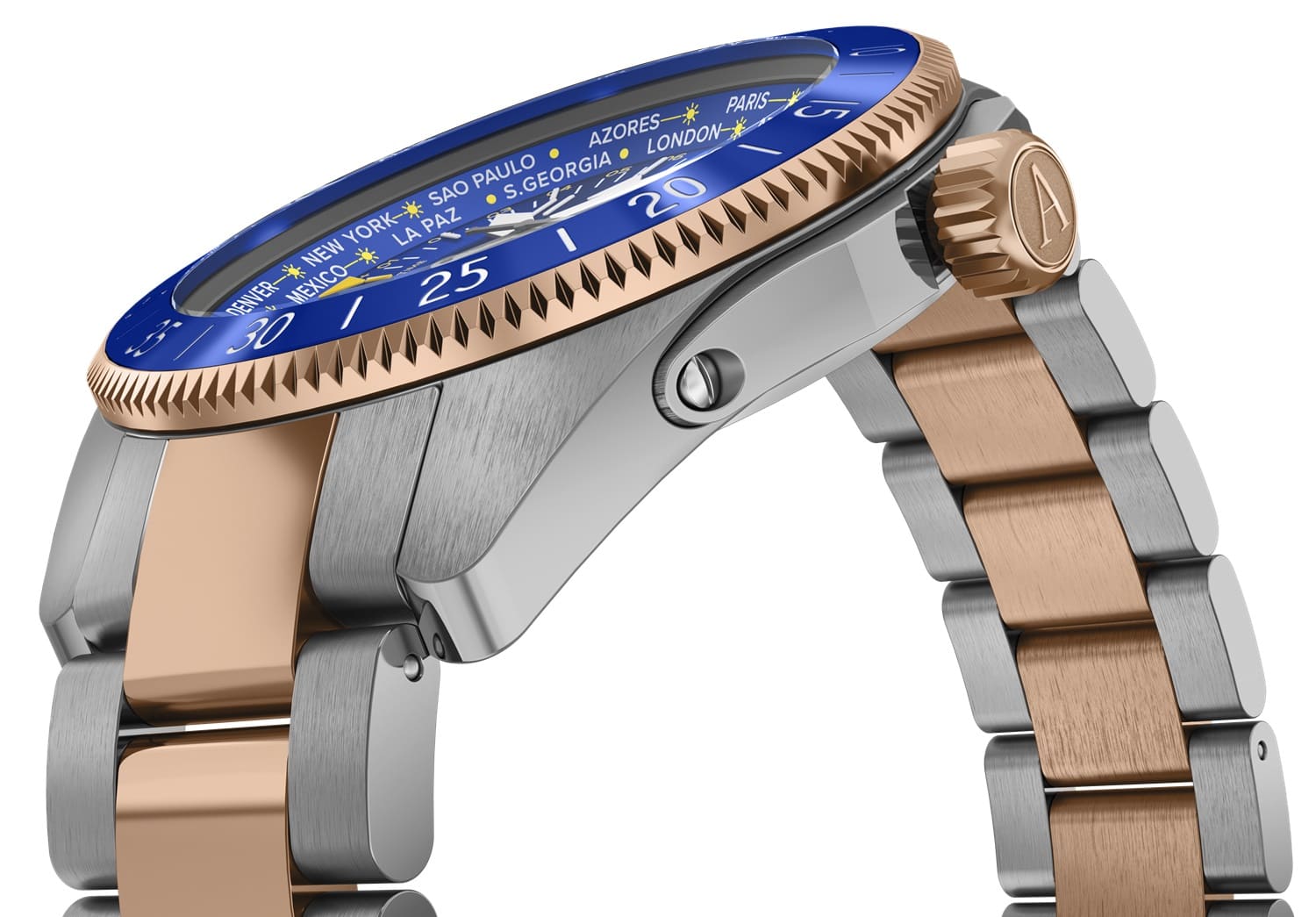 Циферблат защищён сапфировым стекломСапфировое стеклоПрочный и надёжный материал из кристалла сапфира синтетического происхождения, характеризующийся особой твёрдостью и устойчивостью к царапинам и повреждениям. с антибликовым покрытием, гарантирующим чёткий обзор без отражений. Сердцем модели является швейцарский кварцевый механизм Ronda 515.24D, который обеспечивает работу GMT, дату и высшую точность в диапазоне −10/+20 с/мес. .