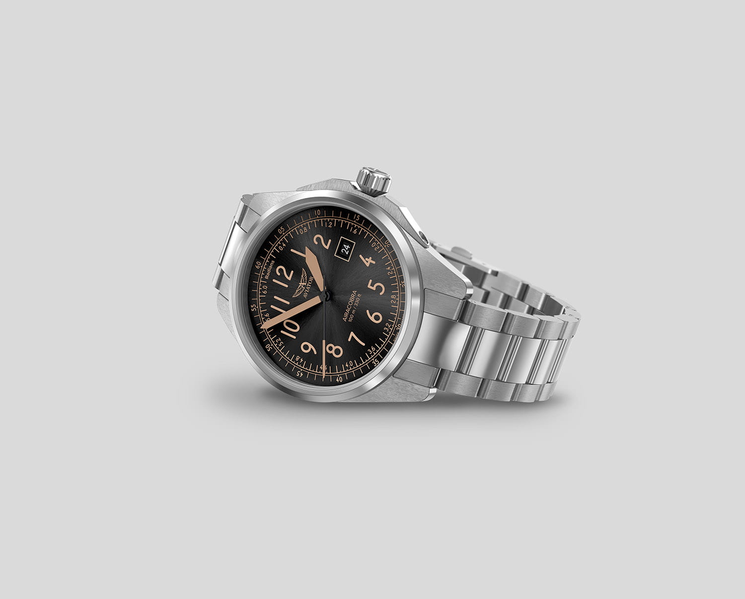 Aviator Airacobra 43 Type B V.1.38.0.323.5 — надёжные швейцарские пилотские часы с насыщенным функционалом и строгим авиационным дизайном. Корпус диаметром 42,8 мм выполнен из нержавеющей стали 316L. Элегантный циферблат имеет крупные арабские цифры. Стрелки и метки покрыты люминесцентным покрытиемЛюминесцентное покрытиеПозволяет считывать показания времени в темноте. Производители наносят на стрелки, часовые индексы, безель или поверхность циферблата светонакопительный состав, дающий холодное свечение. Superluminova — это обеспечивает отличную читаемость в любых условиях. Окошко даты расположено у отметки «3 часа». На борту установлен швейцарский кварцевый механизм, способный с высокой точностью отображать время, дату. В механизме 4 камня. Изысканный циферблат защищён стойким сапфировым стекломСапфировое стеклоПрочный и надёжный материал из кристалла сапфира синтетического происхождения, характеризующийся особой твёрдостью и устойчивостью к царапинам и повреждениям. с антибликовым покрытиемАнтибликовое покрытиеСлой оксида металла в 0,13-0,3 микрон, благодаря которому стекло часов не бликует и не отражает свет. Антибликовое покрытие уменьшает отражение света в 10 раз, обеспечивая отличную читаемость показателей циферблата., завинчивающаяся заводная головка и задняя крышка обеспечивают уровень водозащиты до 100 метров. Стальной браслет с раскладной застёжкойРаскладная застёжкаТакой тип застёжки используется только на браслетах из металла. Она никогда не раскрывается полностью, происходит разделение на 2 и более частей. Раскладывающая застёжка снизит вероятность потери часов к минимуму. обеспечивает удобство и надёжную фиксацию. Airacobra 43 Type B — инструментальные пилотские часы для тех, кто ценит надёжность, точность и удобную функциональность второго часового пояса в эстетике классических авиационных хронометров. Лимитированная серия.
