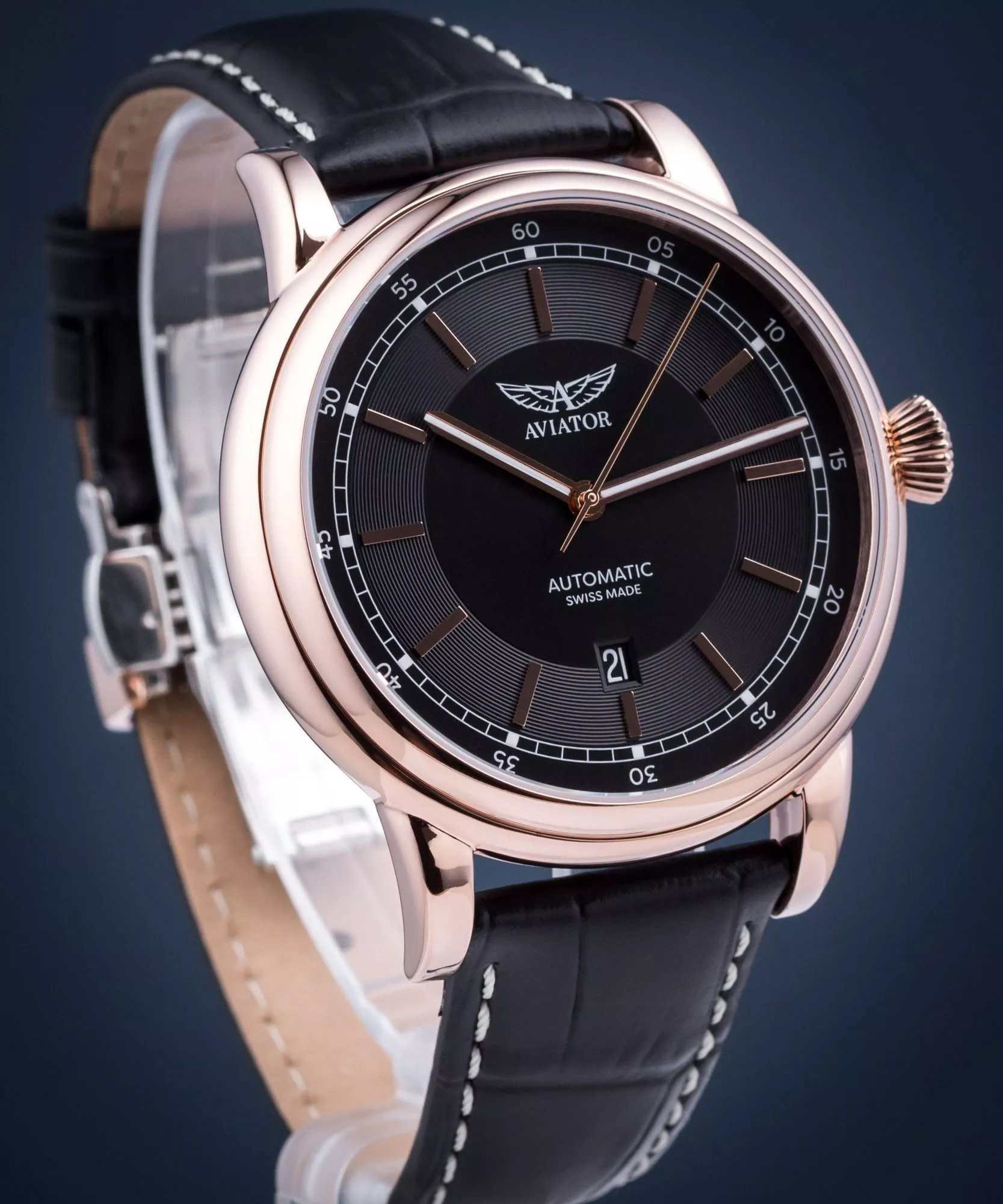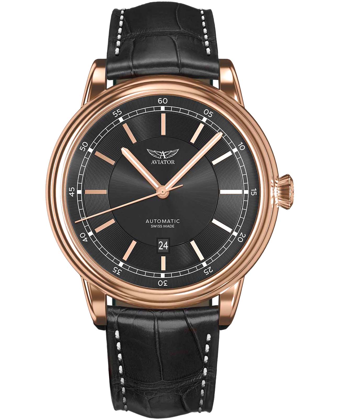 Aviator Douglas DC-3 V.3.32.2.242.4 — швейцарские часы в классике авиадизайна, сочетающие безупречную читаемость и высокую надёжность. Лимитированная серия. Корпус диаметром 45 мм выполнен из нержавеющей стали 316L с PVD-покрытиемPVDУльтратонкое покрытие наносится в технике вакуумного напыления, сочетает в себе нитрид титана особой прочности со слоем золота или оксида хрома. Несёт в себе декоративную или защитную функцию. цвета розового золота. Накладные метки выполнены в виде штрихов. Окошко даты находится в положении 6 часов. Часовые метки и стрелки покрыты люминесцентным покрытиемЛюминесцентное покрытиеПозволяет считывать показания времени в темноте. Производители наносят на стрелки, часовые индексы, безель или поверхность циферблата светонакопительный состав, дающий холодное свечение. Superluminova, позволяющим легко определять время даже в тёмное время суток. Поверхность защищена прочным сапфировым стекломСапфировое стеклоПрочный и надёжный материал из кристалла сапфира синтетического происхождения, характеризующийся особой твёрдостью и устойчивостью к царапинам и повреждениям. с антибликовым покрытием, устойчивым к царапинам. Сердце модели — швейцарский механизм Sellita SW 200, известный своей точностью и долговечностью. Водозащита 100 метров, позволит плавать, нырять и заниматься другими водными видами спорта. Завинчивающаяся головка и задняя крышка обеспечивают уверенную ударопрочностьУдаропрочный корпусМеханизм заключён в корпус, выполненный из современных материалов, устойчивых к ударам, механическим повреждениям и падению с высоты: инновационный пластик, карбон, нержавеющая сталь, титан. и надёжную защиту от влаги и пыли. В механизме 26 камней, запас хода 38 часов. Модель дополнена кожаным ремешком с выразительной текстурой и классическим стилем, закреплённым с помощью застёжке-бабочке с кнопкамиЗастёжка "бабочка"Такой вид застёжки дополняется предохранителями, помогающими избежать случайного раскрытия браслета. Обладают изящным исполнением. — для максимального комфорта и лёгкости в повседневном использовании. Циферблат выполнен по технологии sun-ray (солнечные лучи). Коллекция Douglas была разработана в честь известного американского пассажирского самолета Douglas DC-3. Aviator — это образец лётной точности, инженерной чёткости и сдержанной роскоши, идеально подходящий для тех, кто ценит функциональность и уверенность в каждом элементе.