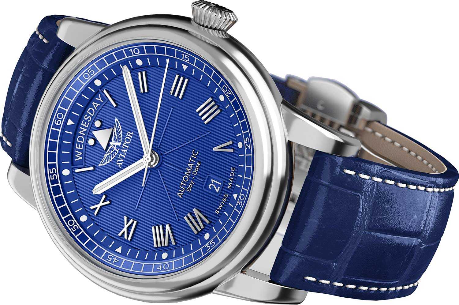 Aviator Douglas Day Date V.3.35.0.276.4 — швейцарские часы в классике авиадизайна, сочетающие безупречную читаемость и высокую надёжность. Лимитированная серия. Корпус диаметром 41,2 мм выполнен из нержавеющей стали 316L. Накладные метки выполнены в виде римских цифр. Окошко даты находится в положении 6 часов. День недели находится в положении 12 часов. Часовые метки и стрелки покрыты люминесцентным покрытиемЛюминесцентное покрытиеПозволяет считывать показания времени в темноте. Производители наносят на стрелки, часовые индексы, безель или поверхность циферблата светонакопительный состав, дающий холодное свечение. Superluminova, позволяющим легко определять время даже в тёмное время суток. Поверхность защищена прочным сапфировым стекломСапфировое стеклоПрочный и надёжный материал из кристалла сапфира синтетического происхождения, характеризующийся особой твёрдостью и устойчивостью к царапинам и повреждениям. с антибликовым покрытием, устойчивым к царапинам. Сердце модели — швейцарский механизм Sellita SW 240-1, известный своей точностью и долговечностью. Водозащита 100 метров, позволит плавать, нырять и заниматься другими водными видами спорта. Завинчивающаяся головка и задняя крышка обеспечивают уверенную ударопрочностьУдаропрочный корпусМеханизм заключён в корпус, выполненный из современных материалов, устойчивых к ударам, механическим повреждениям и падению с высоты: инновационный пластик, карбон, нержавеющая сталь, титан. и надёжную защиту от влаги и пыли. В механизме 26 камней, запас хода до 41 час. Модель дополнена кожаным ремешком с выразительной текстурой и классическим стилем, закреплённым с помощью застёжке-бабочке с кнопкамиЗастёжка "бабочка"Такой вид застёжки дополняется предохранителями, помогающими избежать случайного раскрытия браслета. Обладают изящным исполнением. — для максимального комфорта и лёгкости в повседневном использовании. Модель вдохновлена американским пассажирским самолетом Douglas DC-3, который является одним из лучших самолетов за всю историю авиации. Aviator — это образец лётной точности, инженерной чёткости и сдержанной роскоши, идеально подходящий для тех, кто ценит функциональность и уверенность в каждом элементе.