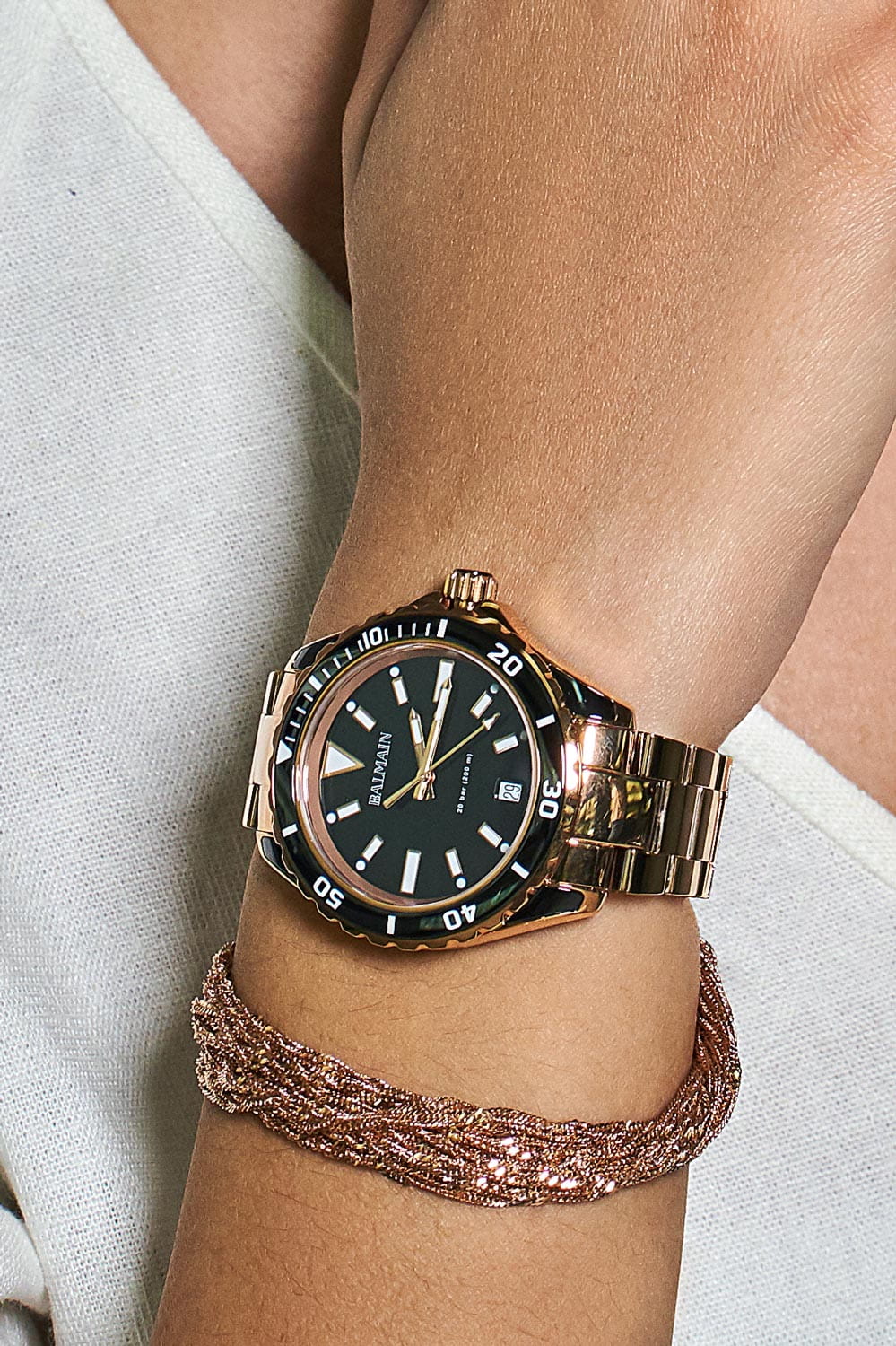 Женские часы Balmain Ophrys B4337.33.65 c кварцевый механизм с высокой точностью. Сапфировое стеклоСапфировое стеклоПрочный и надёжный материал из кристалла сапфира синтетического происхождения, характеризующийся особой твёрдостью и устойчивостью к царапинам и повреждениям. устойчивое к появлению царапин, обладающее высокой прозрачностью. Корпус изготовлен из нержавеющей стали PVD-покрытиемPVDУльтратонкое покрытие наносится в технике вакуумного напыления, сочетает в себе нитрид титана особой прочности со слоем золота или оксида хрома. Несёт в себе декоративную или защитную функцию.. Класс водозащиты: 50 метров, позволит защитить корпус от случайных брызг или капель дождя. Стальной браслет с PVD-покрытиемPVDУльтратонкое покрытие наносится в технике вакуумного напыления, сочетает в себе нитрид титана особой прочности со слоем золота или оксида хрома. Несёт в себе декоративную или защитную функцию.. на застёжке «бабочка» с кнопкамиЗастёжка "бабочка"Такой вид застёжки дополняется предохранителями, помогающими избежать случайного раскрытия браслета. Обладают изящным исполнением. . БезельБезельВнешний ободок, закрепляющий стекло. В спортивных часах так называется поворотное кольцо с делениями на циферблате, выполняет роль таймера – замеряет отрезки времени на шкале. Неподвижный безель – элемент декора. Однонаправленно вращающийся безель на дайверских часах позволяет фиксировать моменты погружения и выныривания на поверхность. с PVD-покрытиемPVDУльтратонкое покрытие наносится в технике вакуумного напыления, сочетает в себе нитрид титана особой прочности со слоем золота или оксида хрома. Несёт в себе декоративную или защитную функцию..