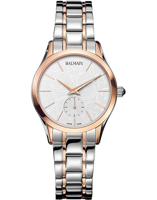 Женские часы Balmain R Lady B4718.33.16 кварцевый механизм с высокой точностью. Сапфировое стеклоСапфировое стеклоПрочный и надёжный материал из кристалла сапфира синтетического происхождения, характеризующийся особой твёрдостью и устойчивостью к царапинам и повреждениям. устойчивое к появлению царапин, обладающее высокой прозрачностью. Корпус изготовлен из нержавеющей стали. Класс водозащиты: 50 метров, позволит защитить корпус от случайных брызг или капель дождя. Стальной браслет с PVD-покрытиемPVDУльтратонкое покрытие наносится в технике вакуумного напыления, сочетает в себе нитрид титана особой прочности со слоем золота или оксида хрома. Несёт в себе декоративную или защитную функцию.. на застёжке «бабочка» с кнопкамиЗастёжка "бабочка"Такой вид застёжки дополняется предохранителями, помогающими избежать случайного раскрытия браслета. Обладают изящным исполнением. .БезельБезельВнешний ободок, закрепляющий стекло. В спортивных часах так называется поворотное кольцо с делениями на циферблате, выполняет роль таймера – замеряет отрезки времени на шкале. Неподвижный безель – элемент декора. Однонаправленно вращающийся безель на дайверских часах позволяет фиксировать моменты погружения и выныривания на поверхность. с PVD-покрытиемPVDУльтратонкое покрытие наносится в технике вакуумного напыления, сочетает в себе нитрид титана особой прочности со слоем золота или оксида хрома. Несёт в себе декоративную или защитную функцию..