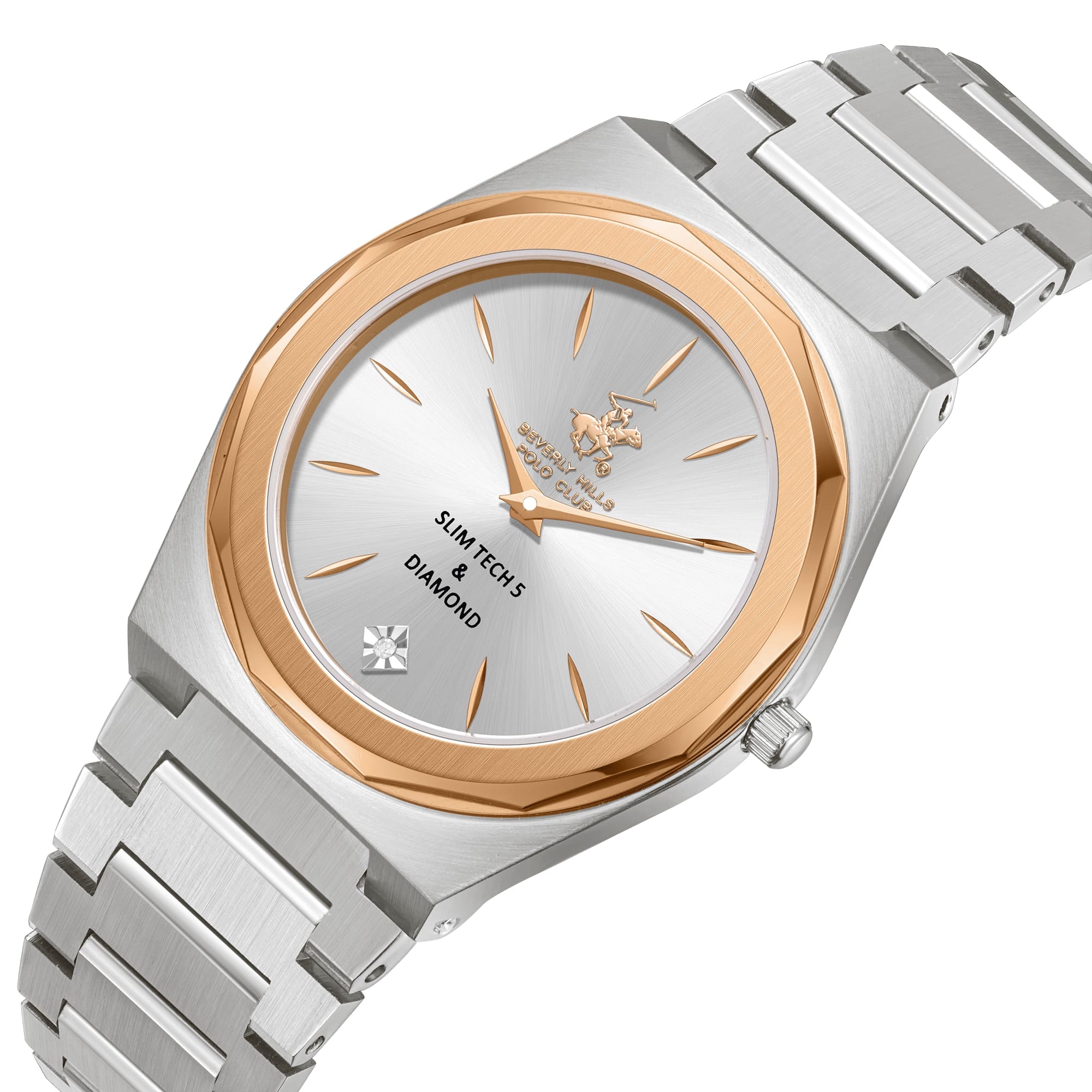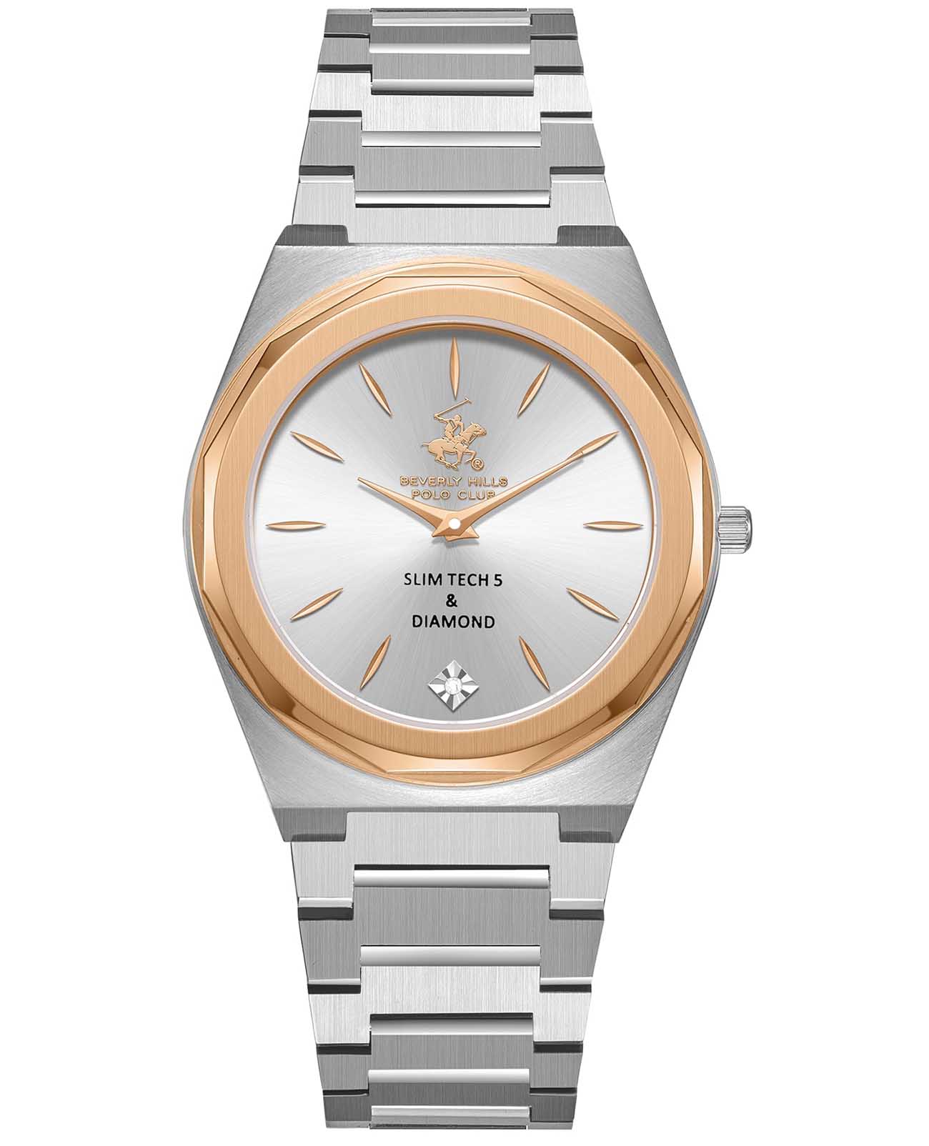 Beverly Hills Polo Club BP3668X.330 – элегантные женские часы, сочетающие стильный дизайн и высокую функциональность. Корпус диаметром 33 мм выполнен из стали, обеспечивающего прочность и долговечность. Циферблат украшен синтетическим бриллиантом, придающим модели роскошный вид, и защищён минеральным стекломМинеральное стеклоМинеральное стекло представляет собой искусственно выращенный минерал кварца. Такое стекло отличается особой устойчивостью к повреждениям и царапинам. Уступает по некоторым качествам сапфировому стеклу., устойчивым к царапинам. БезельБезельВнешний ободок, закрепляющий стекло. В спортивных часах так называется поворотное кольцо с делениями на циферблате, выполняет роль таймера – замеряет отрезки времени на шкале. Неподвижный безель – элемент декора. Однонаправленно вращающийся безель на дайверских часах позволяет фиксировать моменты погружения и выныривания на поверхность. с PVD-покрытиемPVDУльтратонкое покрытие наносится в технике вакуумного напыления, сочетает в себе нитрид титана особой прочности со слоем золота или оксида хрома. Несёт в себе декоративную или защитную функцию.. Часы оснащены точным кварцевым механизмом, гарантирующим надёжное отображение времени. Браслет из нержавеющей стали оснащён раскладной застёжкойРаскладная застёжкаТакой тип застёжки используется только на браслетах из металла. Она никогда не раскрывается полностью, происходит разделение на 2 и более частей. Раскладывающая застёжка снизит вероятность потери часов к минимуму., обеспечивающей комфортное ношение и надёжную фиксацию на запястье. Водозащита до 50 метров (5 ATM) позволяет использовать часы в повседневной жизни, включая кратковременное погружение в воду.