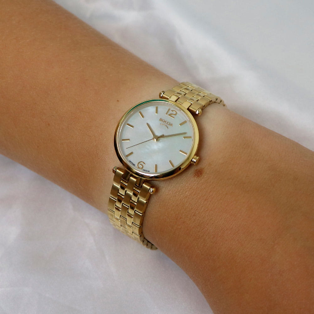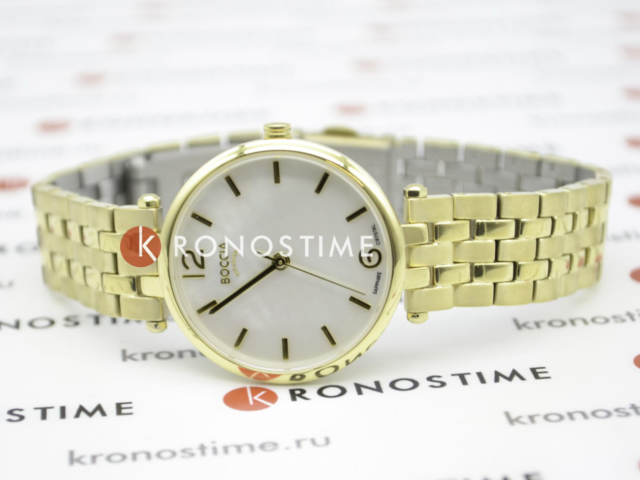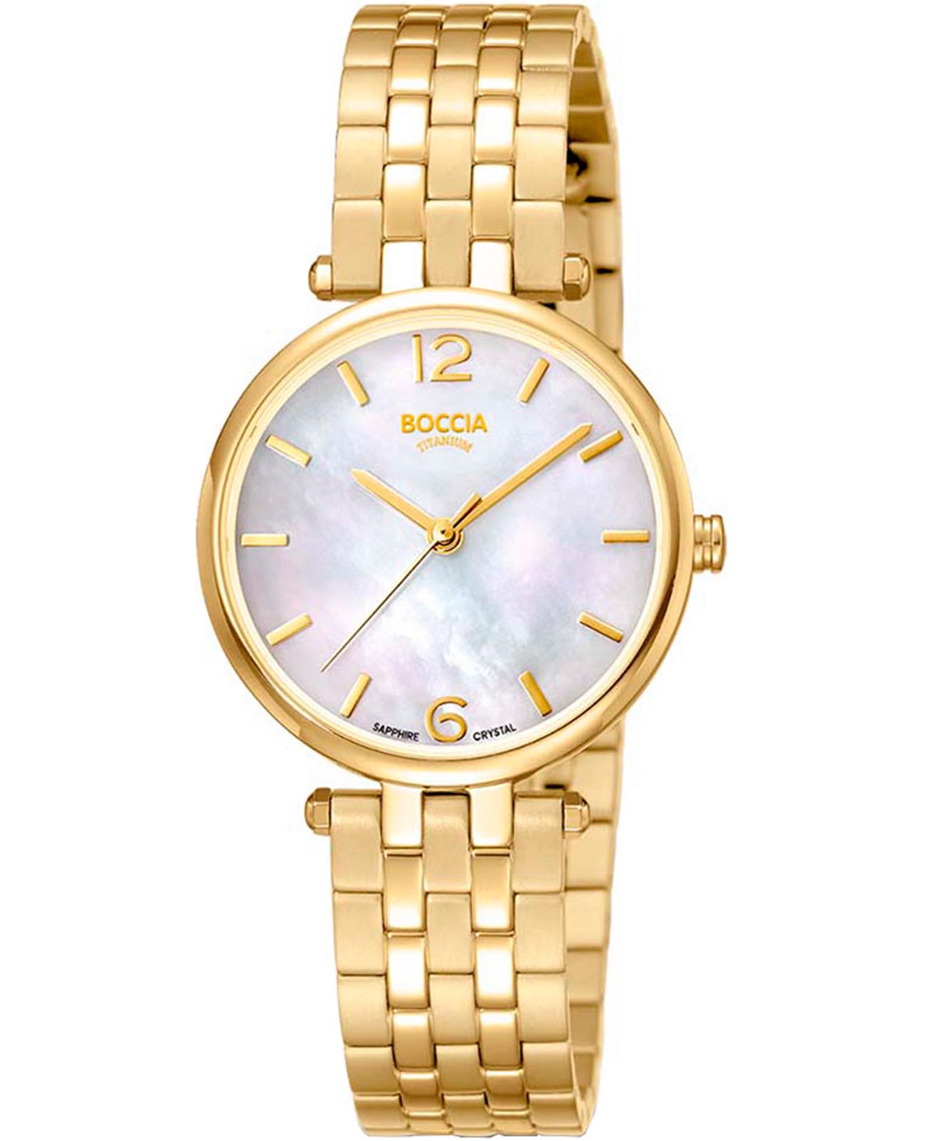 Женские наручные часы Boccia Titanium 3339-03 с надёжным кварцевым механизмом. Корпус и браслет часов изготовлены из титана с PVD-покрытиемPVDУльтратонкое покрытие наносится в технике вакуумного напыления, сочетает в себе нитрид титана особой прочности со слоем золота или оксида хрома. Несёт в себе декоративную или защитную функцию.. Сапфировое стеклоСапфировое стеклоПрочный и надёжный материал из кристалла сапфира синтетического происхождения, характеризующийся особой твёрдостью и устойчивостью к царапинам и повреждениям. устойчивое к мелким механическим повреждениям. Класс водозащиты: 50 метров, позволит защитить корпус от случайных брызг или капель дождя. Титановый браслет на раскладной застёжкеРаскладная застёжкаТакой тип застёжки используется только на браслетах из металла. Она никогда не раскрывается полностью, происходит разделение на 2 и более частей. Раскладывающая застёжка снизит вероятность потери часов к минимуму..