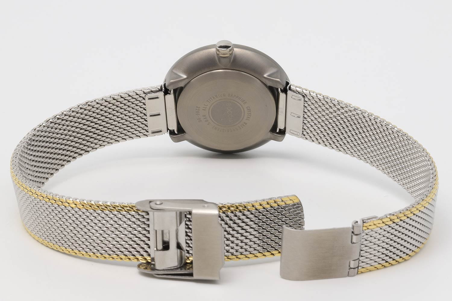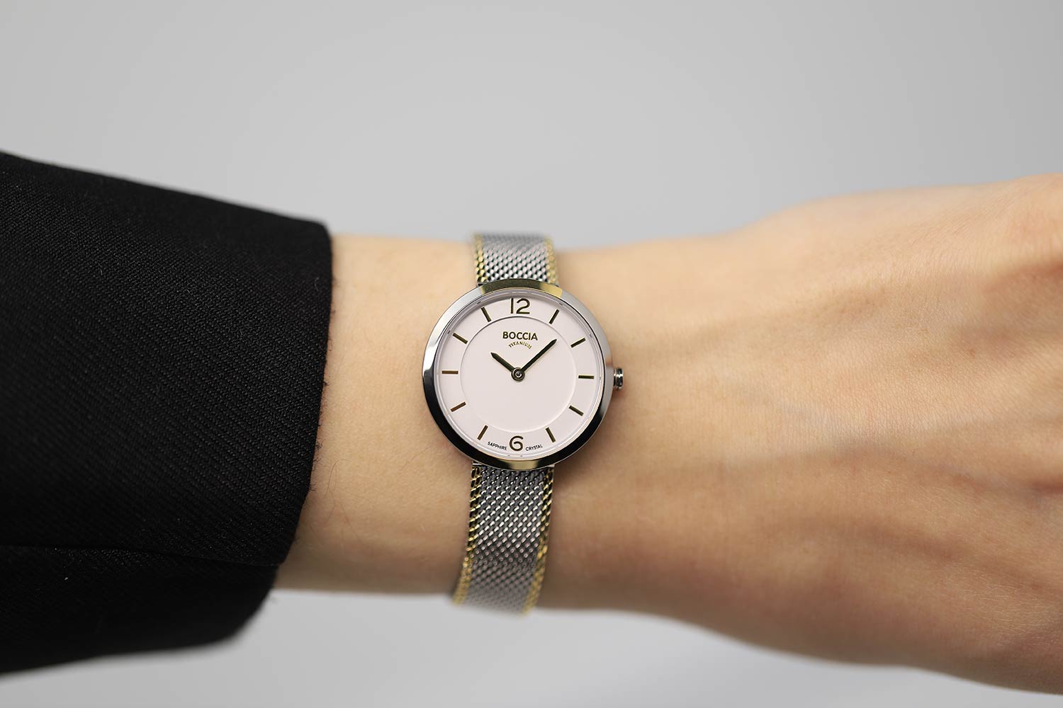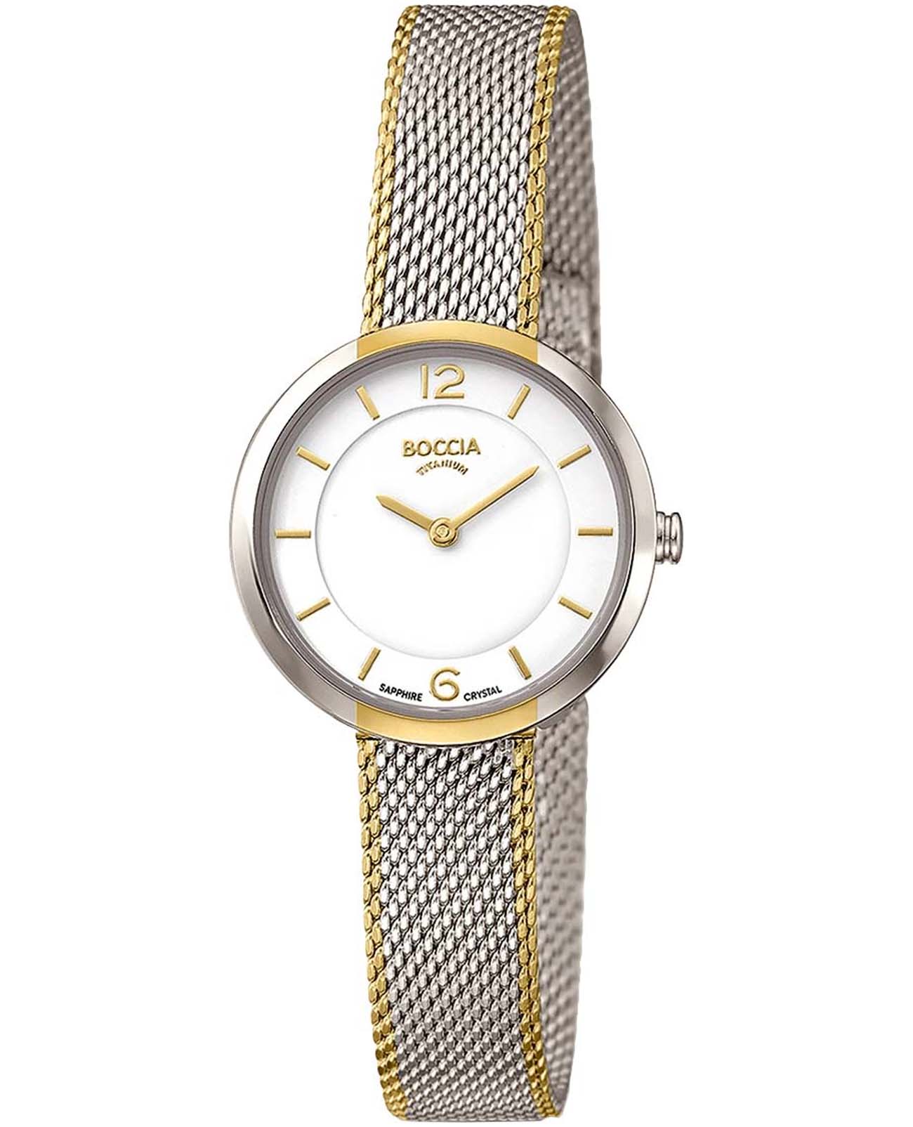 Женские наручные часы Boccia Titanium 3266-06 с надёжным кварцевым механизмом. Корпус часов изготовлен из титана с частичным PVD-покрытиемPVDУльтратонкое покрытие наносится в технике вакуумного напыления, сочетает в себе нитрид титана особой прочности со слоем золота или оксида хрома. Несёт в себе декоративную или защитную функцию.. Сапфировое стеклоСапфировое стеклоПрочный и надёжный материал из кристалла сапфира синтетического происхождения, характеризующийся особой твёрдостью и устойчивостью к царапинам и повреждениям. устойчивое к мелким механическим повреждениям. Класс водозащиты: 30 метров, позволит защитить корпус от случайных брызг или капель дождя. Удобный браслет миланского плетения на раскладном замкеРаскладной замокДанный вариант застежки используется только на часах с металлическим браслетом. Отличительная особенность такого крепления в том, что длина браслета становится универсальной и вы можете самостоятельно отрегулировать нужный вам размер – застежка просто двигается по браслету часов..