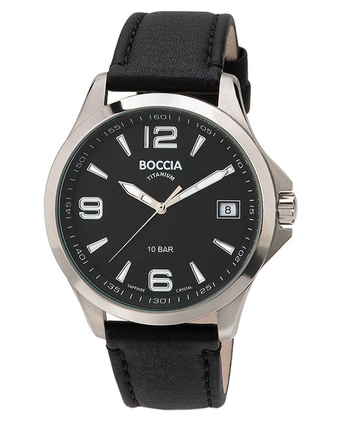 Мужские немецкие титановые часы Boccia Titanium Circle-Oval 3591-01, кварцевый механизм с высокой точностью. Сапфировое стеклоСапфировое стеклоПрочный и надёжный материал из кристалла сапфира синтетического происхождения, характеризующийся особой твёрдостью и устойчивостью к царапинам и повреждениям. устойчивое к появлению царапин, обладающее высокой прозрачностью. Корпус изготовлен из титана. Стрелки с люминесцентным покрытиемЛюминесцентное покрытиеПозволяет считывать показания времени в темноте. Производители наносят на стрелки, часовые индексы, безель или поверхность циферблата светонакопительный состав, дающий холодное свечение.. Окошко даты в положении 3 часов. Класс водозащиты: 100 метров, позволит плавать, нырять и заниматься другими водными видами спорта. Кожаный браслет на стандартной застежке.