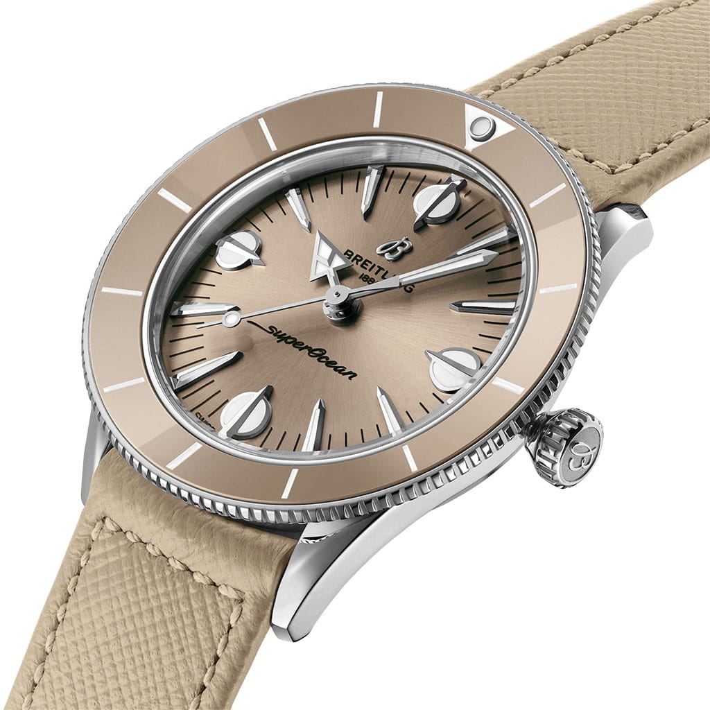 Красочная дань уважения часовой компании Breitling оригинальной модели SuperOcean и воплощение пляжного стиля. В капсульной коллекции Superocean Heritage ’57 Pastel Paradise использованы некоторые элементы дизайна первой модели SuperOcean 1957 года выпуска, такие как вогнутый керамический безель, крупные индексы и часовая стрелка в форме стрелы.