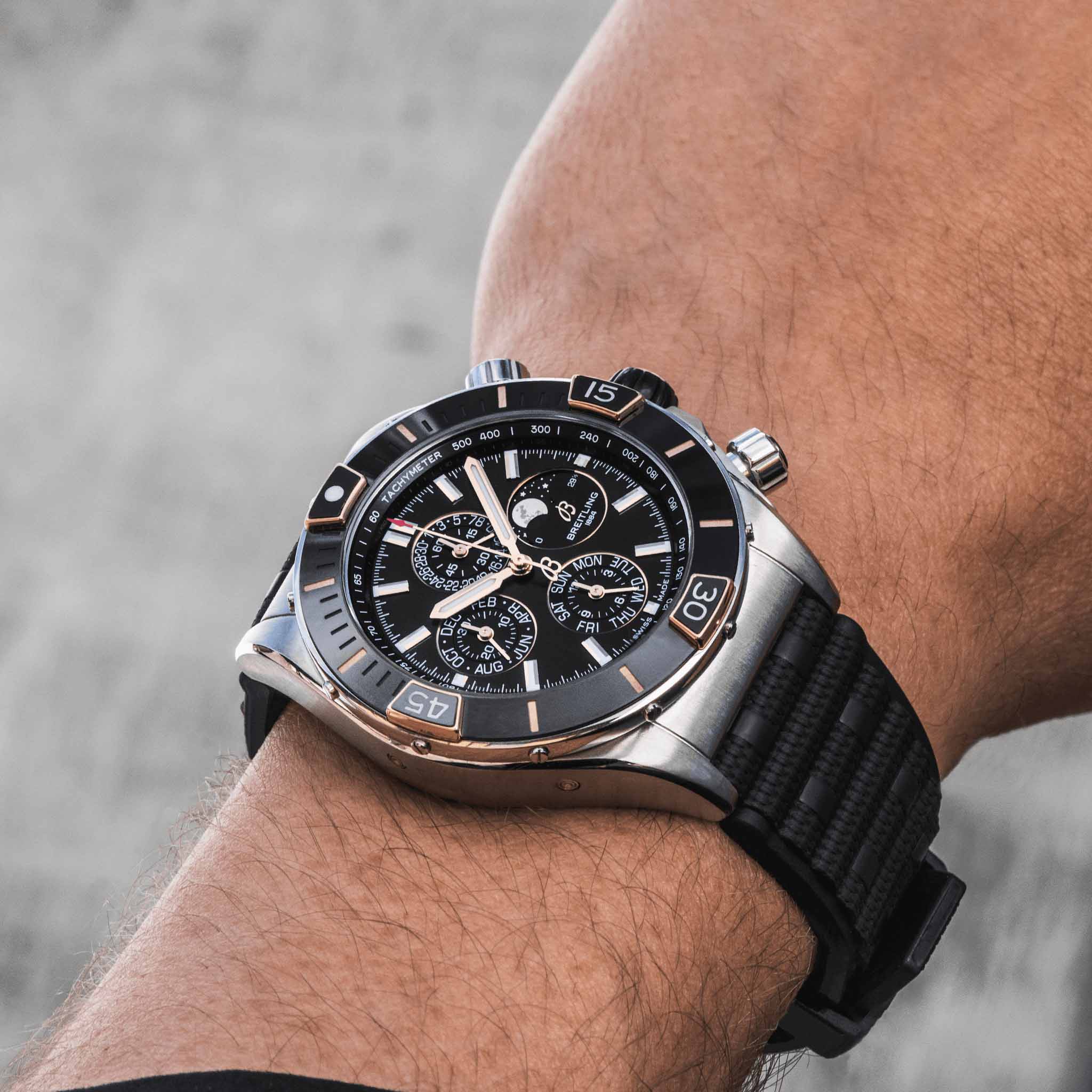 Образ завершает каучуковый ремешок в стиле Rouleaux с раскладной застежкой. В корпусе часов Super Chronomat 44 Four-Year Calendar спрятан мануфактурный калибр Breitling 19, сертифицированный Швейцарским институтом официального тестирования хронометров (COSC). Модель оснащена механизмом календаря, который необходимо корректировать один раз в четыре года, или раз в 1461 день – каждый високосный год .