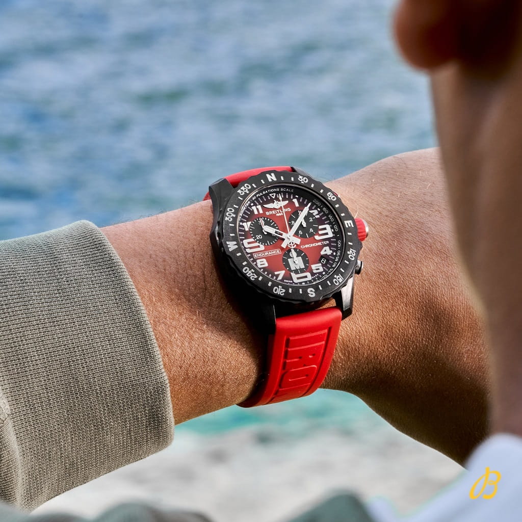Швейцарские часы Breitling Endurance Pro IRONMAN® X823109A1K1S1 с узнаваемым красным циферблатом IRONMAN® и фирменным каучуковым ремешком с двойной классической застежкой Breitlight® оснащена калибром Breitling 82 и сертифицированным Швейцарским институтом официального тестирования хронометров (COSC) кварцевым механизмом хронографа SuperQuartz™, обеспечивающим исключительную точность.
