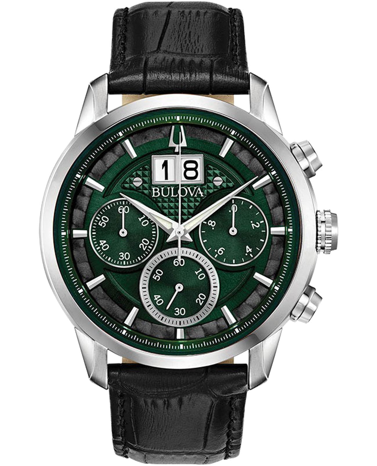 Мужские кварцевые часы-хронографХронографФункция позволяет измерять отрезки времени с особой точностью: часы, минуты, секунды. Верным признаком хронографа является наличие на циферблате 3 дополнительных окошек-счётчиков. Bulova Sutton 96B310 – отражающий идеальное сочетание современного дизайна, надёжности и функциональности. Элегантный облик станет превосходным завершением образа, наделив его индивидуальным характером. Корпус из нержавеющей стали серебристого цвета, диаметром 44 мм идеально сбалансирован и элегантен. Минеральное стеклоМинеральное стеклоМинеральное стекло представляет собой искусственно выращенный минерал кварца. Такое стекло отличается особой устойчивостью к повреждениям и царапинам. Уступает по некоторым качествам сапфировому стеклу. защищает циферблат от царапин и устойчивое к мелким механическим повреждениям. Малые циферблат на 60 секунд, 60 минут, 10 часов. Большая дата в позиции 12 часов. Кожаный ремешок на застёжке-бабочке с кнопкамиЗастёжка "бабочка"Такой вид застёжки дополняется предохранителями, помогающими избежать случайного раскрытия браслета. Обладают изящным исполнением. обеспечивает комфортное ношение. Водозащита 30 метров позволит защитить корпус от случайных брызг или капель дождя. Стрелки с люминесцентным покрытиемЛюминесцентное покрытиеПозволяет считывать показания времени в темноте. Производители наносят на стрелки, часовые индексы, безель или поверхность циферблата светонакопительный состав, дающий холодное свечение. позволяющие легко определять время даже в темноте. Эта модель – отличный выбор для тех, кто ищет сочетание стиля, качества и функциональности. Часы станут не только полезным аксессуаром, но и выразительным элементом вашего имиджа.