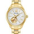 Женские механические часы с автоподзаводом Bulova Automatic Ladies 97L172 – отражающий идеальное сочетание современного дизайна, надёжности и функциональности. Элегантный облик станет превосходным завершением образа, наделив его индивидуальным характером. Корпус из нержавеющей стали с IP-покрытиемIP-покрытиеМетод ионного напыления. Демонстрирует повышенную устойчивость к истиранию, окислению и химическим веществам. Под воздействием высокого давления и температуры около 1500°C молекулы металла надёжно соединяются с частицами корпуса часов. золотистого цвета, диаметром 35 мм идеально сбалансирован и элегантен. Защиту циферблата обеспечивает прочное сапфировое стеклоСапфировое стеклоПрочный и надёжный материал из кристалла сапфира синтетического происхождения, характеризующийся особой твёрдостью и устойчивостью к царапинам и повреждениям., гарантирующее четкость показаний. Циферблат из белого перламутра украшен золотистыми стрелками и метками, а также апертуром, открывающим вид на автоматический механизм. Браслет из нержавеющей стали с IP-покрытиемIP-покрытиеМетод ионного напыления. Демонстрирует повышенную устойчивость к истиранию, окислению и химическим веществам. Под воздействием высокого давления и температуры около 1500°C молекулы металла надёжно соединяются с частицами корпуса часов. на застёжке-бабочке с кнопкамиЗастёжка "бабочка"Такой вид застёжки дополняется предохранителями, помогающими избежать случайного раскрытия браслета. Обладают изящным исполнением. обеспечивает комфортное ношение. Водозащита 30 метров позволит защитить корпус от случайных брызг или капель дождя. Эта модель – отличный выбор для тех, кто ищет сочетание стиля, качества и функциональности. Часы станут не только полезным аксессуаром, но и выразительным элементом вашего имиджа.