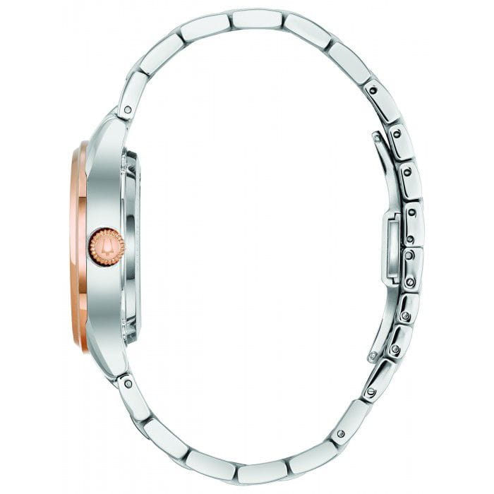 Женские механические часы с автоподзаводом Bulova Automatic Ladies 98P170 – отражающий идеальное сочетание современного дизайна, надёжности и функциональности. Элегантный облик станет превосходным завершением образа, наделив его индивидуальным характером. Корпус из нержавеющей стали с неподвижным безелемБезельВнешний ободок, закрепляющий стекло. В спортивных часах так называется поворотное кольцо с делениями на циферблате, выполняет роль таймера – замеряет отрезки времени на шкале. Неподвижный безель – элемент декора. Однонаправленно вращающийся безель на дайверских часах позволяет фиксировать моменты погружения и выныривания на поверхность. с IP-покрытиемIP-покрытиеМетод ионного напыления. Демонстрирует повышенную устойчивость к истиранию, окислению и химическим веществам. Под воздействием высокого давления и температуры около 1500°C молекулы металла надёжно соединяются с частицами корпуса часов. золотистого цвета, диаметром 34 мм идеально сбалансирован и элегантен. Защиту циферблата обеспечивает прочное сапфировое стеклоСапфировое стеклоПрочный и надёжный материал из кристалла сапфира синтетического происхождения, характеризующийся особой твёрдостью и устойчивостью к царапинам и повреждениям., гарантирующее четкость показаний. Циферблат из белого перламутра украшен золотистыми стрелками и бриллиантами, а также апертуром, открывающим вид на автоматический механизм. Браслет из нержавеющей стали с частичным IP-покрытиемIP-покрытиеМетод ионного напыления. Демонстрирует повышенную устойчивость к истиранию, окислению и химическим веществам. Под воздействием высокого давления и температуры около 1500°C молекулы металла надёжно соединяются с частицами корпуса часов. на застёжке-бабочке с кнопкамиЗастёжка "бабочка"Такой вид застёжки дополняется предохранителями, помогающими избежать случайного раскрытия браслета. Обладают изящным исполнением. обеспечивает комфортное ношение. Водозащита 30 метров позволит защитить корпус от случайных брызг или капель дождя. Эта модель – отличный выбор для тех, кто ищет сочетание стиля, качества и функциональности. Часы станут не только полезным аксессуаром, но и выразительным элементом вашего имиджа.