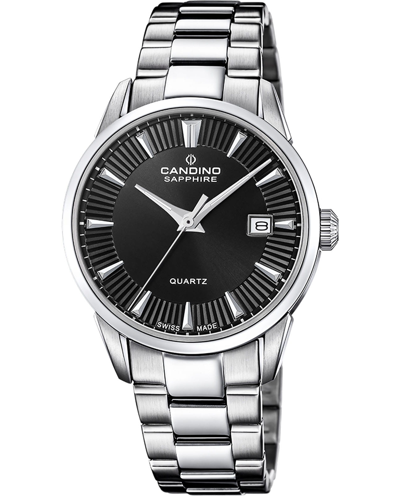Мужские кварцевые часы Candino сочетают стильный дизайн и надёжность. Корпус выполнен из стали и защищён сапфировым стекломСапфировое стеклоПрочный и надёжный материал из кристалла сапфира синтетического происхождения, характеризующийся особой твёрдостью и устойчивостью к царапинам и повреждениям., устойчивым к царапинам. Циферблат чёрного цвета оформлен метками, стрелки покрыты люминесцентным покрытиемЛюминесцентное покрытиеПозволяет считывать показания времени в темноте. Производители наносят на стрелки, часовые индексы, безель или поверхность циферблата светонакопительный состав, дающий холодное свечение., что обеспечивает хорошую читаемость в темноте. Часы отображают часы, минуты, секунды и дату. Браслет стальной, фиксируется на раскладной застёжкеРаскладная застёжкаТакой тип застёжки используется только на браслетах из металла. Она никогда не раскрывается полностью, происходит разделение на 2 и более частей. Раскладывающая застёжка снизит вероятность потери часов к минимуму.. Водонепроницаемость составляет 100 WR, что позволяет использовать часы для плавания, ныряния и других водных видов спорта.