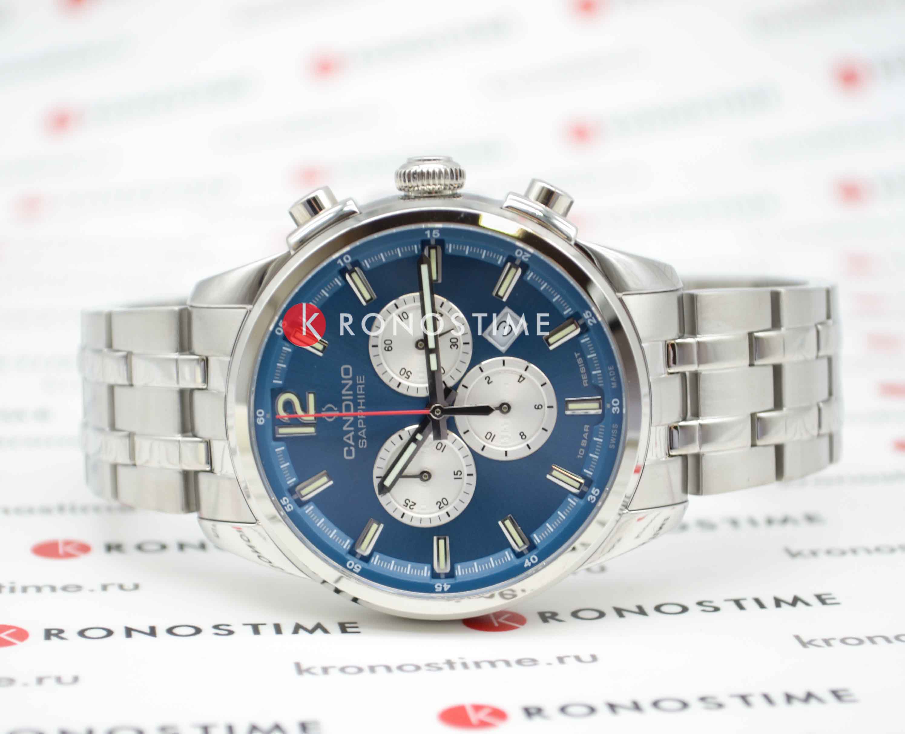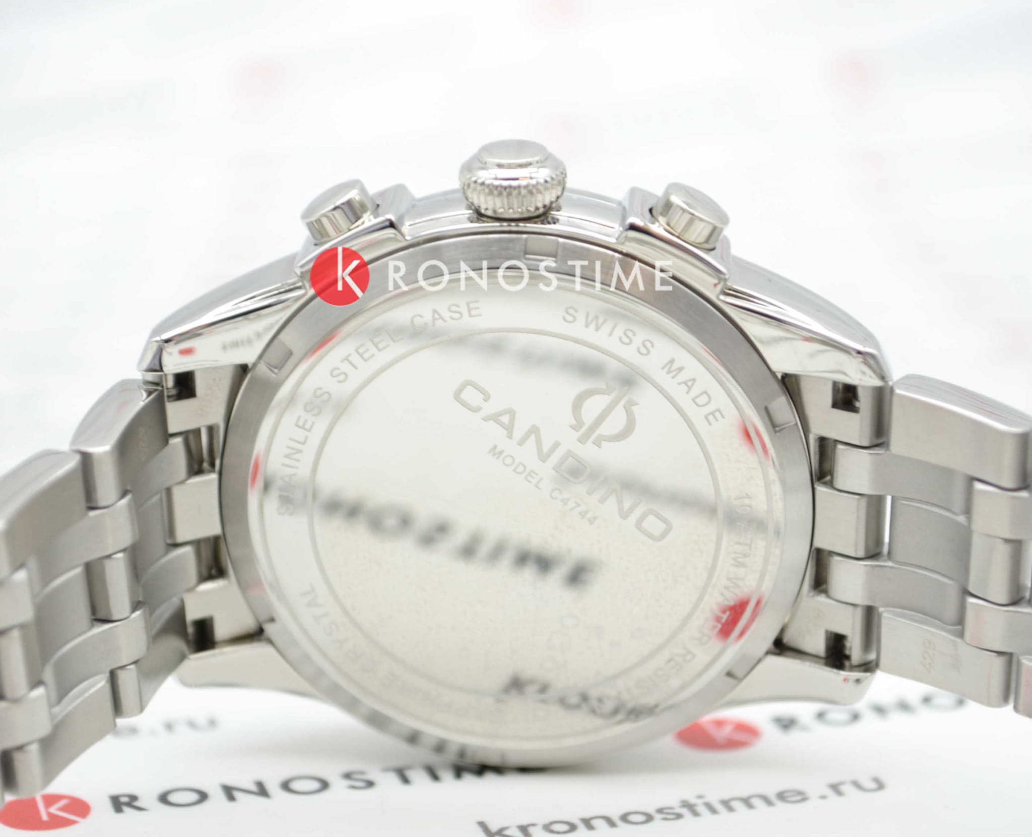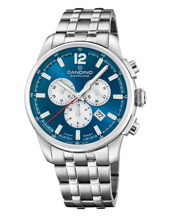 Швейцарские мужские наручные часы-хронографХронографФункция позволяет измерять отрезки времени с особой точностью: часы, минуты, секунды. Верным признаком хронографа является наличие на циферблате 3 дополнительных окошек-счётчиков. Candino Chronograph C4744/5, кварцевый механизм с высокой точностью. Сапфировое стеклоСапфировое стеклоПрочный и надёжный материал из кристалла сапфира синтетического происхождения, характеризующийся особой твёрдостью и устойчивостью к царапинам и повреждениям. устойчивое к появлению царапин, обладающее высокой прозрачностью. Часы, минуты, секунды. Индикация даты. Класс водозащиты: 100 метров, позволит плавать, нырять и заниматься другими водными видами спорта. Раскладная застёжкаРаскладная застёжкаТакой тип застёжки используется только на браслетах из металла. Она никогда не раскрывается полностью, происходит разделение на 2 и более частей. Раскладывающая застёжка снизит вероятность потери часов к минимуму. с фиксатором. Корпус часов изготовлен из нержавеющей стали. Стрелки и метки с люминесцентным покрытиемЛюминесцентное покрытиеПозволяет считывать показания времени в темноте. Производители наносят на стрелки, часовые индексы, безель или поверхность циферблата светонакопительный состав, дающий холодное свечение..