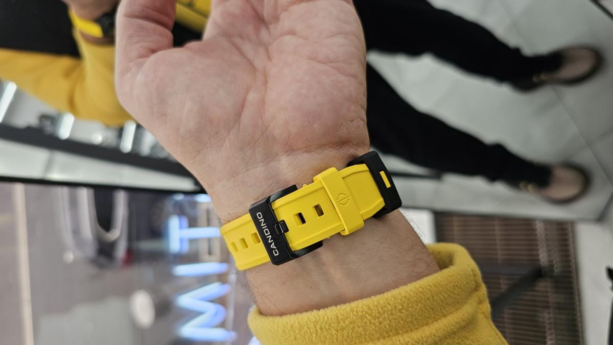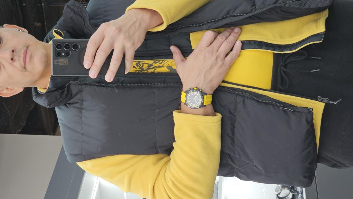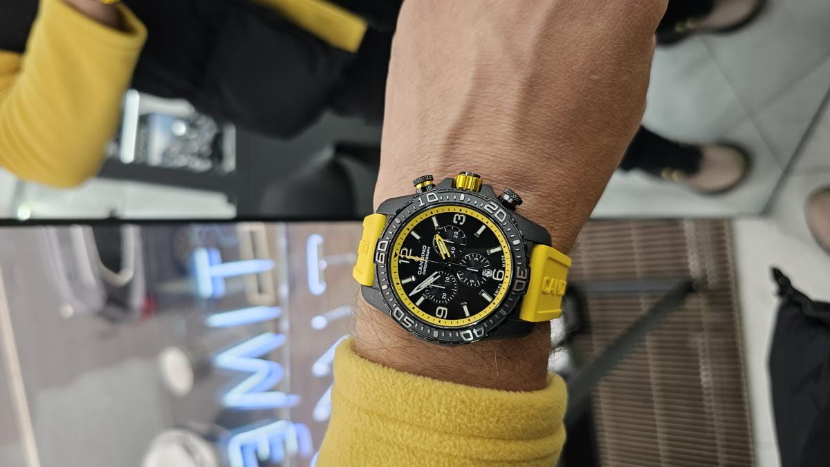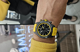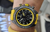 Корпус часов изготовлен из карбона, что придаёт им прочность и долговечность. Класс водозащиты 100 метров позволяет носить часы в условиях активного водного спорта, включая плавание, ныряние и другие водные виды спорта. Каучуковый ремешок на стандартной застёжке обеспечивает комфортное и надёжное крепление на запяте. Стрелки и метки с люминесцентным покрытиемЛюминесцентное покрытиеПозволяет считывать показания времени в темноте. Производители наносят на стрелки, часовые индексы, безель или поверхность циферблата светонакопительный состав, дающий холодное свечение.. Окошко даты находится в положении 6 часов.