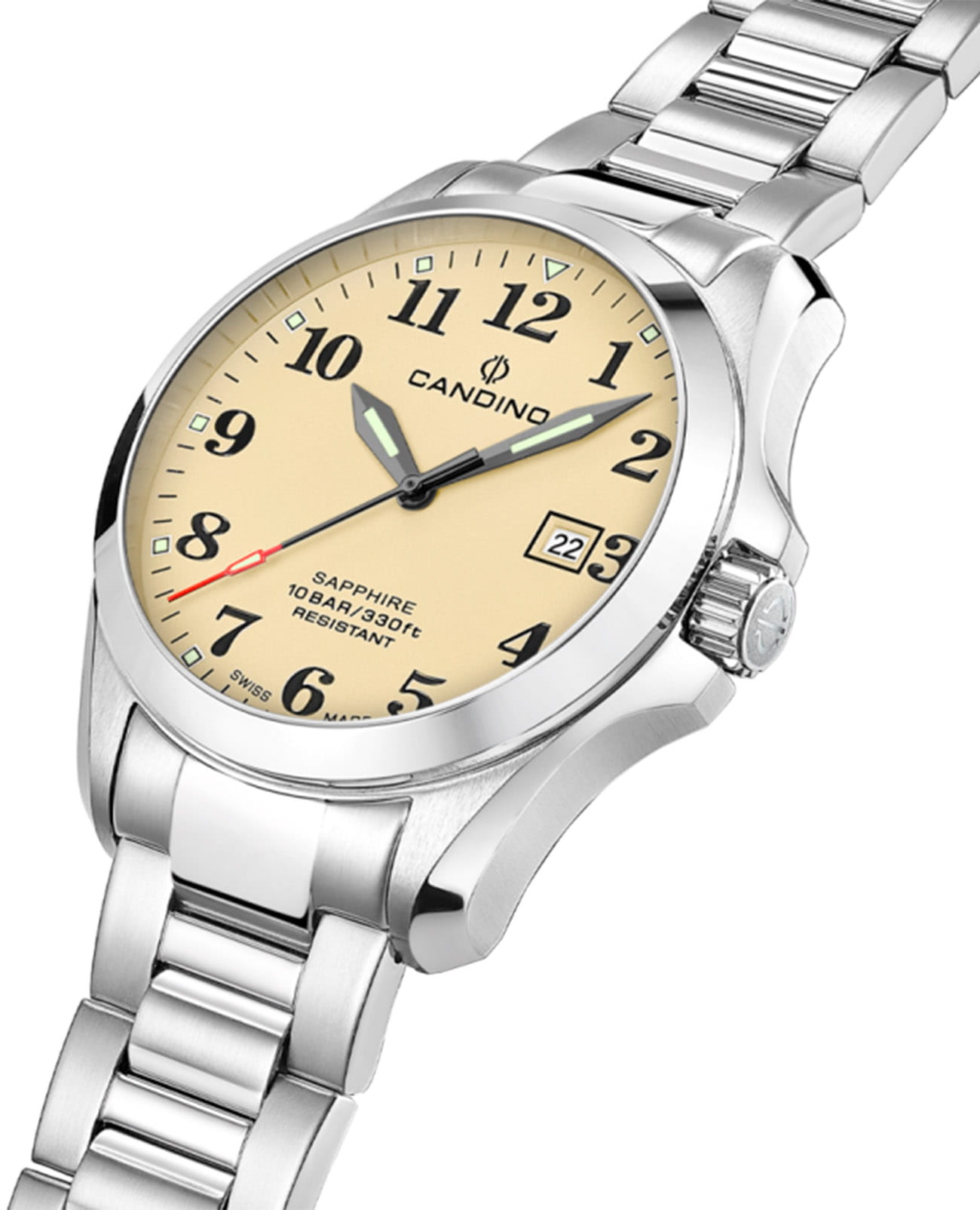Мужские кварцевые часы Candino C4785/1 — это стильный и надёжный аксессуар швейцарского производства, подчёркивающий индивидуальность и хороший вкус. Корпус круглой формы выполнен из нержавеющей стали и защищён сапфировым стекломСапфировое стеклоПрочный и надёжный материал из кристалла сапфира синтетического происхождения, характеризующийся особой твёрдостью и устойчивостью к царапинам и повреждениям., устойчивым к царапинам. Циферблат бежевого цвета оформлен арабскими цифрами, а стрелки и метки оснащены люминесцентным покрытиемЛюминесцентное покрытиеПозволяет считывать показания времени в темноте. Производители наносят на стрелки, часовые индексы, безель или поверхность циферблата светонакопительный состав, дающий холодное свечение., обеспечивающим хорошую читаемость в темноте. Окошко даты расположено на отметке 3 часа, что делает часы не только элегантными, но и функциональными. Часы оснащены стальным браслетом серебристого цвета с раскладной застёжкойРаскладная застёжкаТакой тип застёжки используется только на браслетах из металла. Она никогда не раскрывается полностью, происходит разделение на 2 и более частей. Раскладывающая застёжка снизит вероятность потери часов к минимуму., который обеспечивает комфорт при ношении. Водонепроницаемость 100 м позволяет использовать часы в повседневных условиях, включая плавание. Модель сочетает в себе классический стиль, швейцарское качество и надёжность, оставаясь универсальным выбором для любого случая. В комплекте предусмотрены два ремешка из кожи и текстиля.