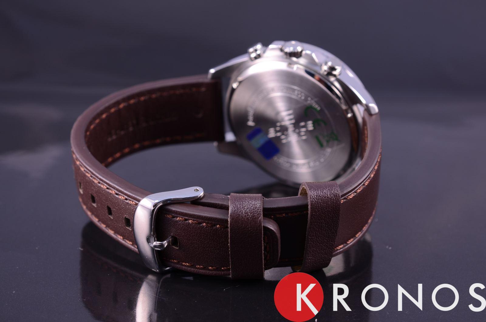 Мужские классические наручные часы Casio Edifice надежные и практичные. Кварцевый японский механизм Miyota. Точность хода не хуже -10 +15 сек./в месяц. Часы оснащены функцией хронографа. Циферблат белого цвета с контрастными индексами. Стрелки и индексы с светонакопительным нанесением. Корпус выполнен из нержавеющей стали. Безель с IP покрытием коричневого цвета. Ремешок из натуральной кожи, коричневого цвета. Минеральное стекло устойчиво к появлению царапин. Водонепроницаемость 100М. В часах можно плавать. Степень водонепроницаемости не является величиной, эквивалентной функциональной рабочей глубине.