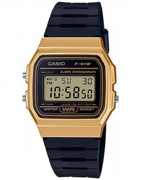 Электронные часы в чёрно-золотом исполнении напоминают первые модели от Casio благодаря винтажному 8-угольному ударопрочному корпусуУдаропрочный корпусМеханизм заключён в корпус, выполненный из современных материалов, устойчивых к ударам, механическим повреждениям и падению с высоты: инновационный пластик, карбон, нержавеющая сталь, титан., сделанному из надёжного пластика. Аксессуар с кварцевым механизмом работает от батарейки, характеризующейся высоким сроком службы - до 7 лет. Циферблат оснащён светодиодной микроподсветкойСветодиодная подсветкаСветодиодная или LED-подсветка обеспечивает появление яркого холодного свечения за счёт LED-элементов - маленьких лампочек. Они потребляют минимальное количество энергии, чаще всего можно встретить 1 светодиод, в нижней части циферблата., освещающей его сбоку. Органическое стекло легко полируется. Гибкий полимерный ремешок. Ежедневный будильник, секундомер, автоматический календарь, 12 и 24-х часовое отображение времени. Габариты: 33,2 x 38 x 8,5 мм.