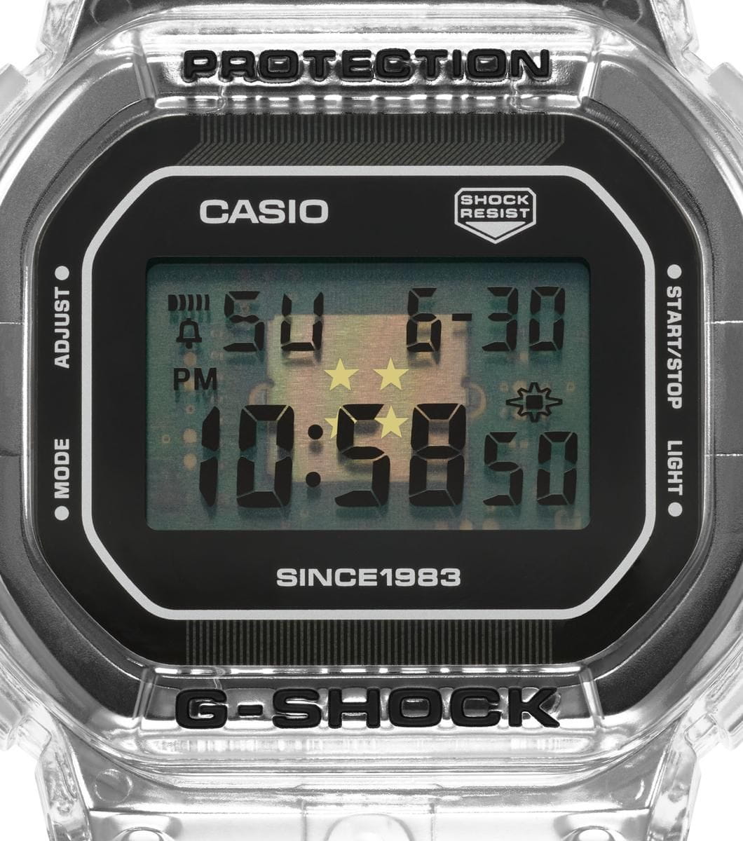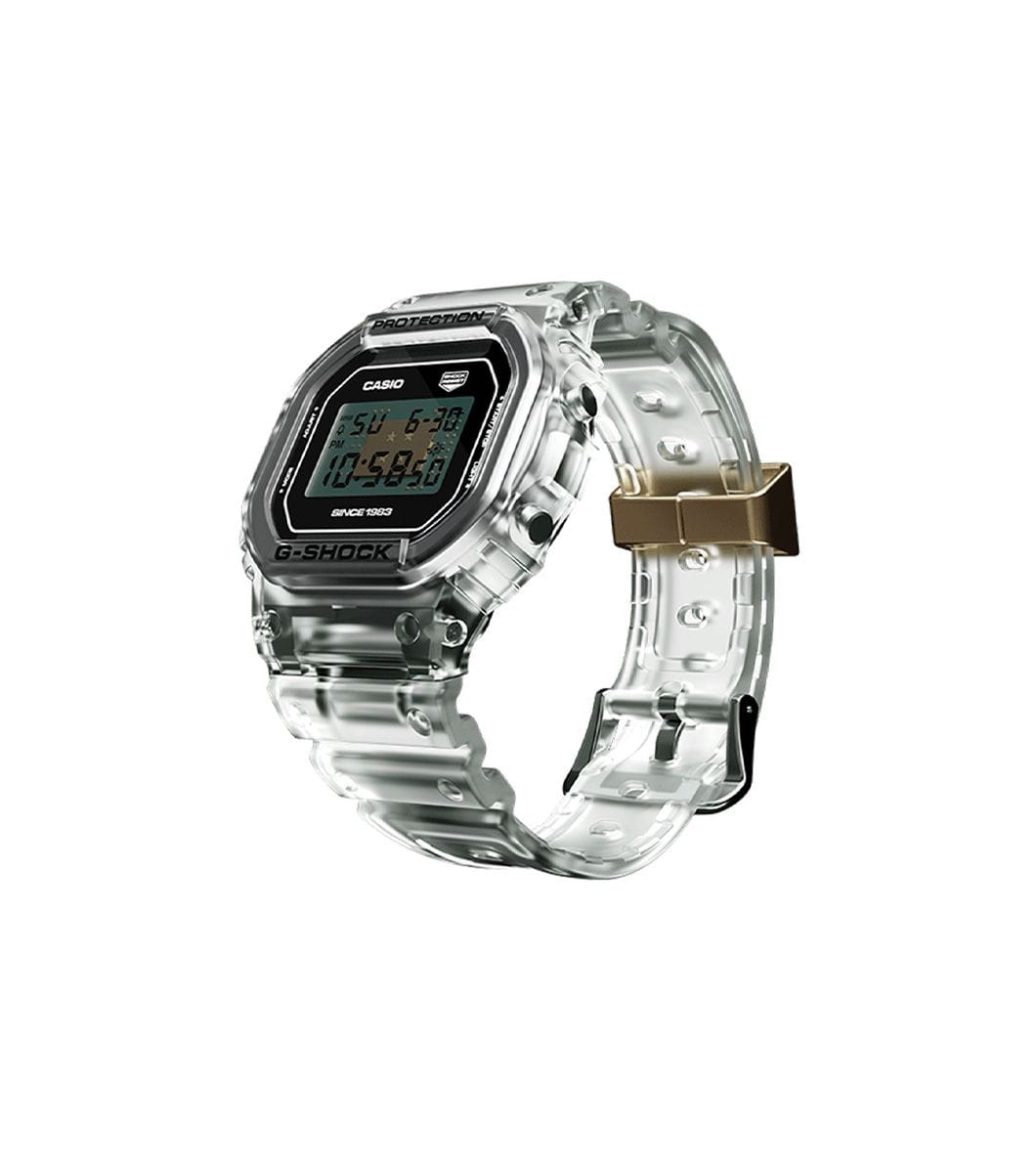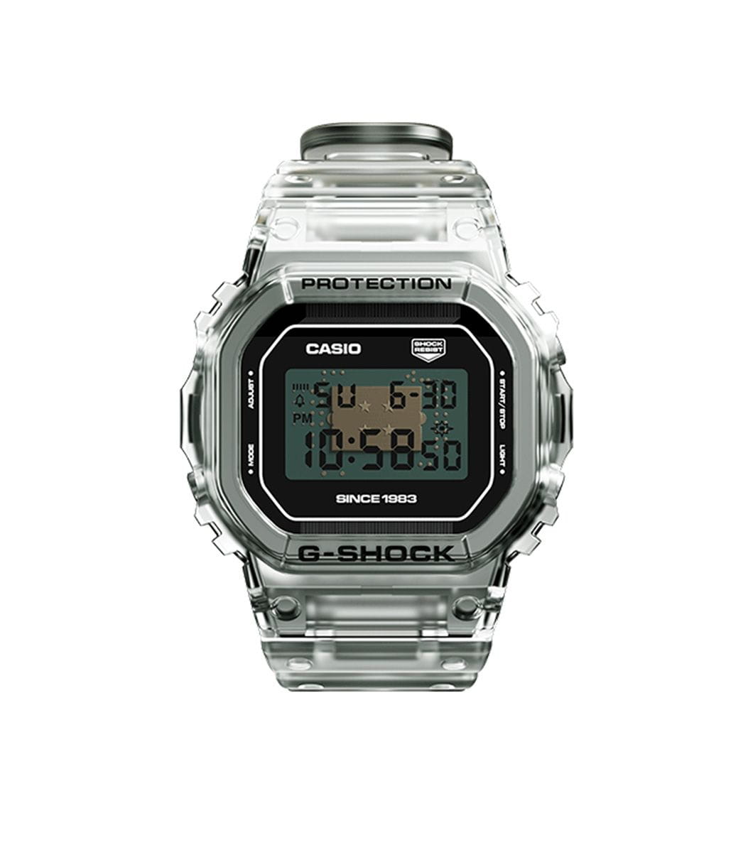 Спортивные японские мужские часы с секундомеромСекундомерСекундоме́р — прибор, способный измерять интервалы времени с точностью до долей секунды. лимитированной коллекции Clear Remix к 40-летию G-SHOCK Casio G-Shock DW-5040RX-7, кварцевый механизм с высокой точностью. Издавая звуковой сигнал в установленное время, будильникБудильникБуди́льник — часы, в заданный момент времени подающие звуковой, световой и/или в редких случаях другой сигнал. напоминает о событиях, которые повторяются каждый день. Корпус часов изготовлен из нержавеющей стали. Класс водозащиты: 200 метров, позволит плавать, нырять и заниматься другими водными видами спорта. Каучуковый прозрачный ремешок на стандартной застежке.