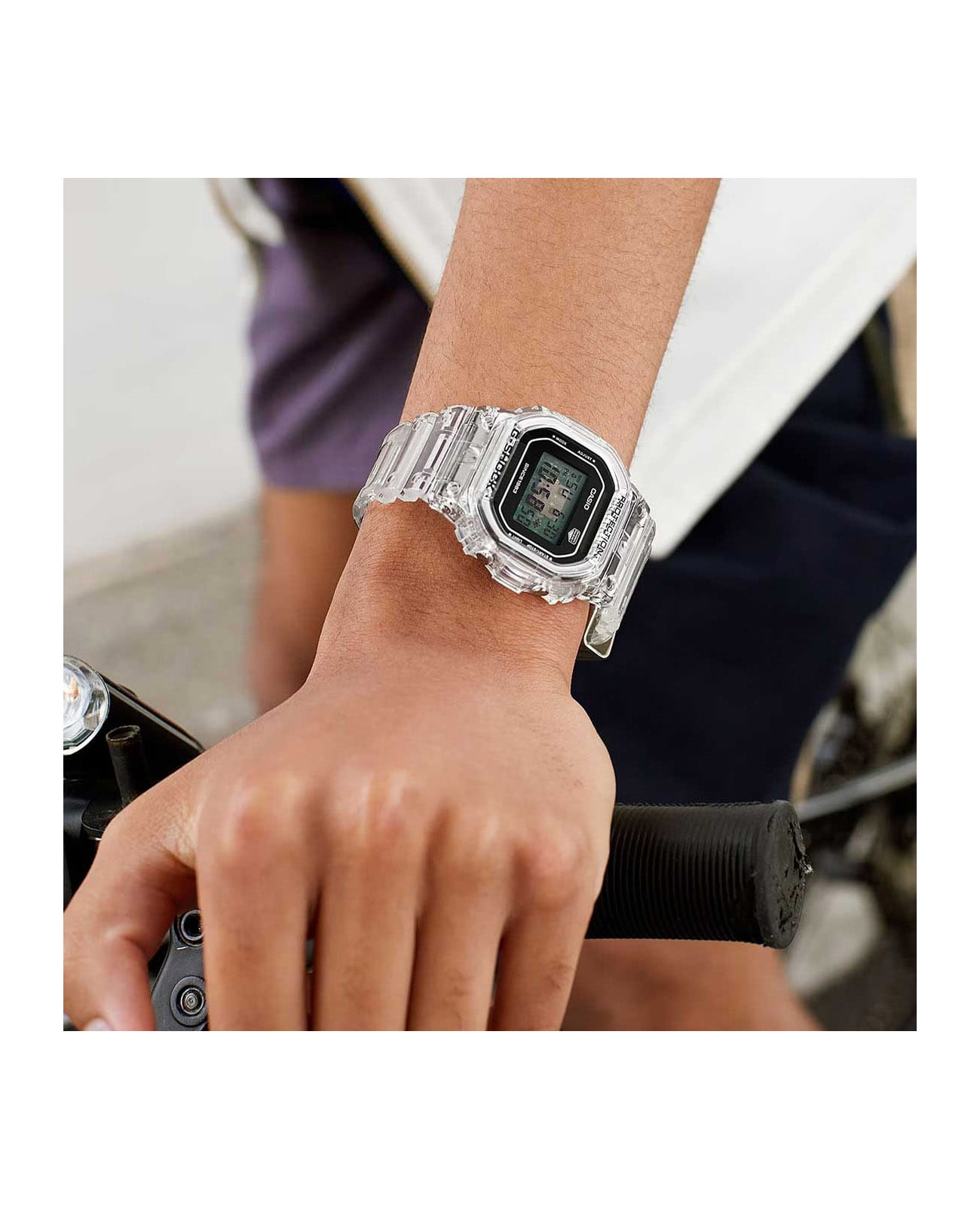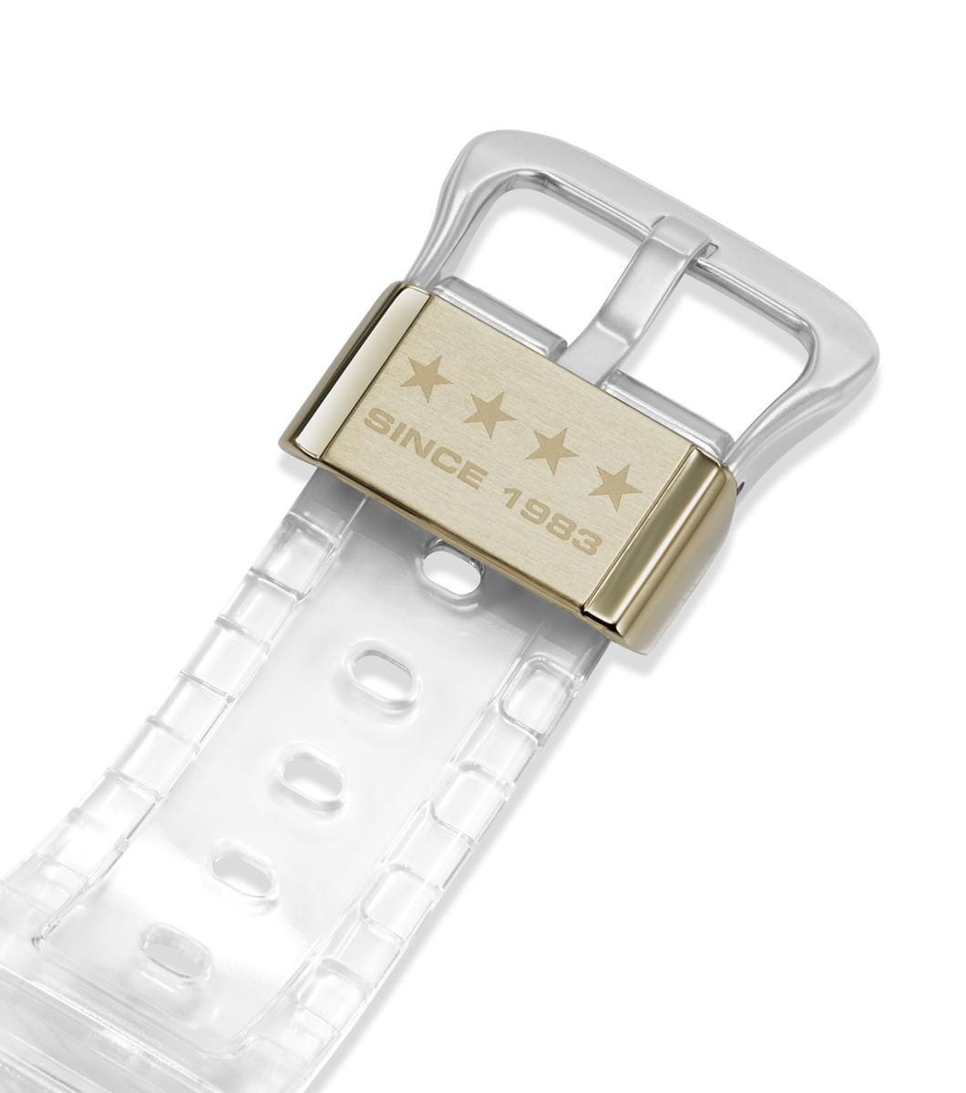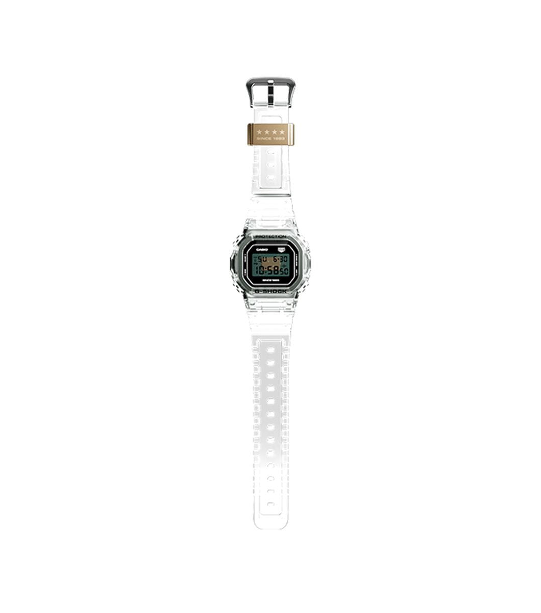 Спортивные японские мужские часы с секундомеромСекундомерСекундоме́р — прибор, способный измерять интервалы времени с точностью до долей секунды. лимитированной коллекции Clear Remix к 40-летию G-SHOCK Casio G-Shock DW-5040RX-7, кварцевый механизм с высокой точностью. Издавая звуковой сигнал в установленное время, будильникБудильникБуди́льник — часы, в заданный момент времени подающие звуковой, световой и/или в редких случаях другой сигнал. напоминает о событиях, которые повторяются каждый день. Корпус часов изготовлен из нержавеющей стали. Класс водозащиты: 200 метров, позволит плавать, нырять и заниматься другими водными видами спорта. Каучуковый прозрачный ремешок на стандартной застежке.