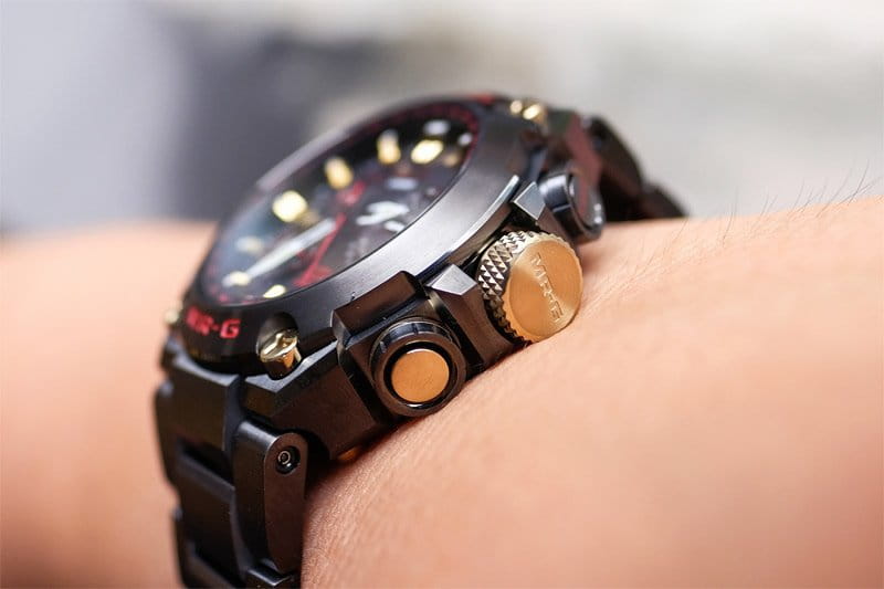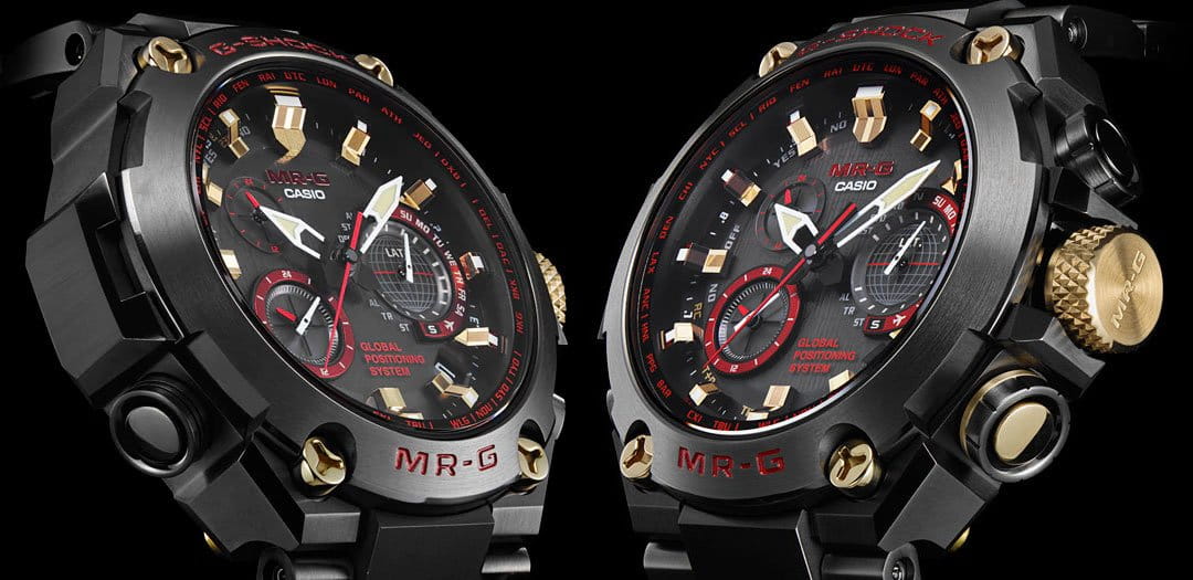 Премиальная серия m-rg от знаменитой марки часов Casio представлена моделью G-SHOCK MRG-G1000B-1A4 в самурайской красно-золотой цветовой гамме.