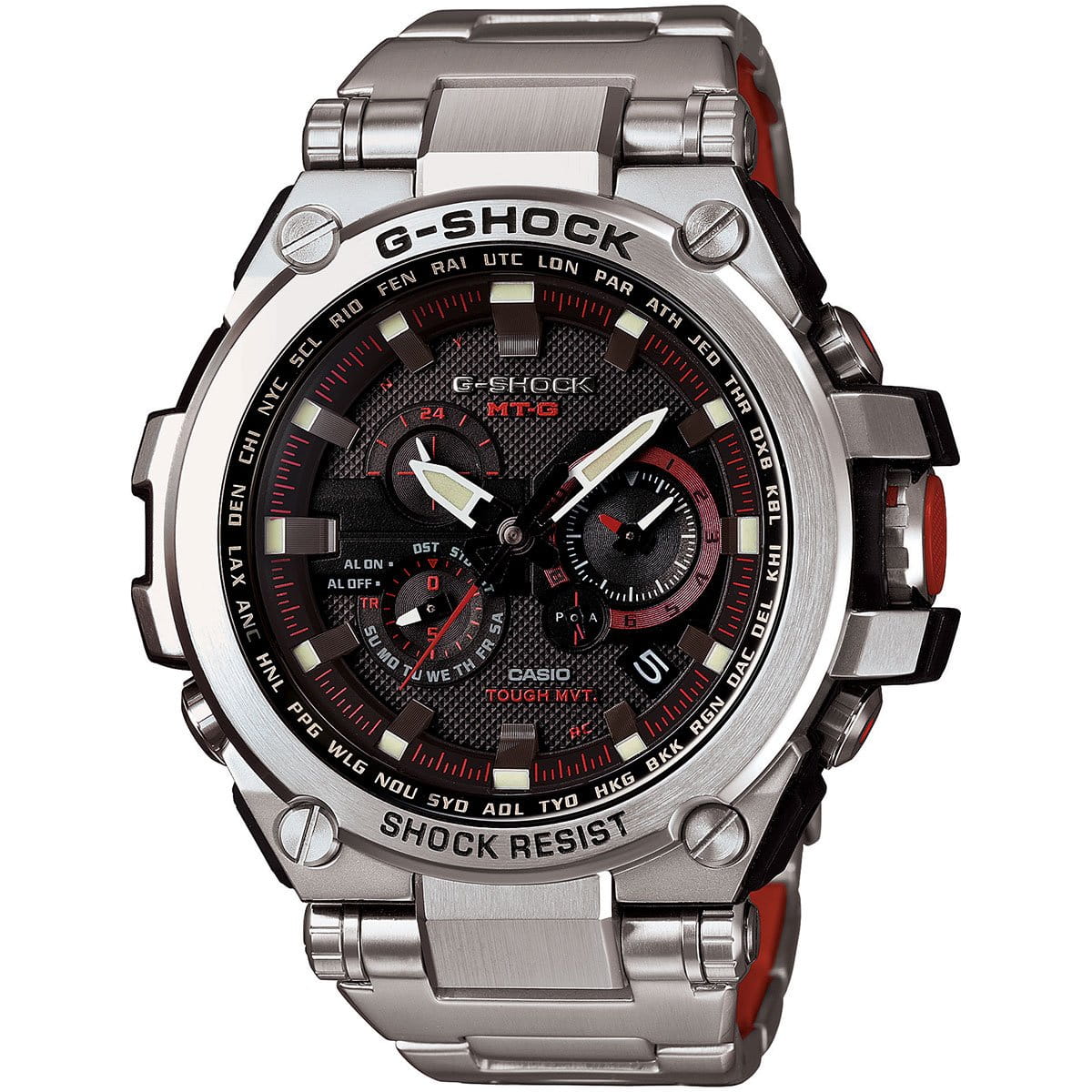 Современные мужские японские наручные часы. Премиум коллекция G-shock MT-G. Корпус и браслет выполнены из высокопрочной стали с аникоррозийными свойствами с пластиковыми вставками. Черный фон циферблата разбавлен объемными светлыми 3D индексами и красными элементами дизайна. Сапфировое стекло с антибликовым покрытием, устойчивое к появлению царапин. Часы снабжены множеством дополнительных функций - секундомер, полностью автоматическая подсветка с автоматической регулируемой автоматизацией. Ежечасный сигнал, повтор сигнала будильника, второй часовой пояс. Водонепроницаемость часов до 200 метров (возможны занятия дайвингом). Ударопрочные и магнитоустойчивые, источник энергии солнечная батарея.