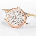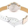 Стильные женские наручные часы, выполненные в fashion стиле. Кварцевые часы с элементом питания SR920SW. Корпус часов выполнен из высокопрочной стали с полным IP покрытием золотого цвета. Золотые индексы и стрелки на светлом циферблате. Водонепроницаемость часов 50 метров, минеральное стекло, устойчивое к царапинам. Украшены часы кристаллами Swarovski.  Ремешок из натуральной кожи белого цвета прочно удерживает часы на руке.