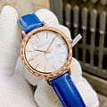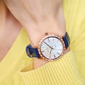 Дизайнеры декорировали безельБезельВнешний ободок, закрепляющий стекло. В спортивных часах так называется поворотное кольцо с делениями на циферблате, выполняет роль таймера – замеряет отрезки времени на шкале. Неподвижный безель – элемент декора. Однонаправленно вращающийся безель на дайверских часах позволяет фиксировать моменты погружения и выныривания на поверхность. модели сияющими кристаллами Swarovski, привлекательно смотрится перламутровый циферблат. Японский кварцевый механизм защищён стальным корпусом с IP-покрытиемIP-покрытиеМетод ионного напыления. Демонстрирует повышенную устойчивость к истиранию, окислению и химическим веществам. Под воздействием высокого давления и температуры около 1500°C молекулы металла надёжно соединяются с частицами корпуса часов. цвета розового золота. Синий ремешок выполнен из натуральной кожи. Сохраняется водостойкость при давлении до 5 бар.