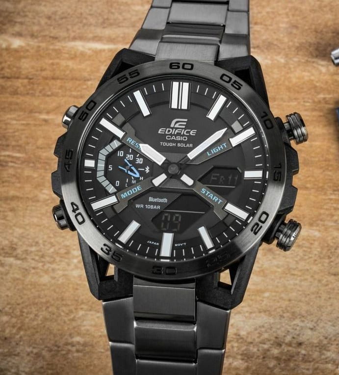 Многофункциональные японские мужские часы Casio Edifice ECB-2000DС-1A.Супер стильный релиз в коллекции Edifice из топовой аналого-цифровой серии ECB-2000. Среди функций питание от солнечной энергии Tough SolarTough SolarТехнология основана на подзарядке аккумулятора от источника солнечного света, специальная панель улавливает солнечные лучи и преобразует их в энергию для работы часов. Достаточно пары минут нахождения на солнце для функционирования часов в течении суток., автоматическое сохранение энергии. Время работы аккумулятора без подзарядки приблизительно 7 месяцев, при включенной функции сохранения энергии приблизительно 18 месяцев. Двойная светодиодная подсветка Super Illuminator с функцией Afterglow. Цвет подсветки: белый. 12-ти и 24-х часовой формат времени. Секундомер с двумя точностями показаний: 1/100с (до 1ч) и 1с (после 1ч) и временем измерения 24ч. SPLIT-хронографСплит-хронографИспользуется для измерения продолжительности нескольких временных отрезков, начинающихся одновременно, а заканчивающихся в разное время.. Таймер обратного отсчета от 1с до 24ч. Мировое времяМировое время Полезное часовое усложнение, отображающее время в основных городах и известных областях по всему миру, оно связано с часовыми поясами, удобно для путешественников и бизнесменов. – 38 часовых поясов, всемирное координированное время (UTCUTCВсемирное кординационное время, не имеющее привязки к географическому положению Гринвича, основывается на атомном отсчёте времени. Регулировка времени осуществляется более точно, чем устаревшее GMT.