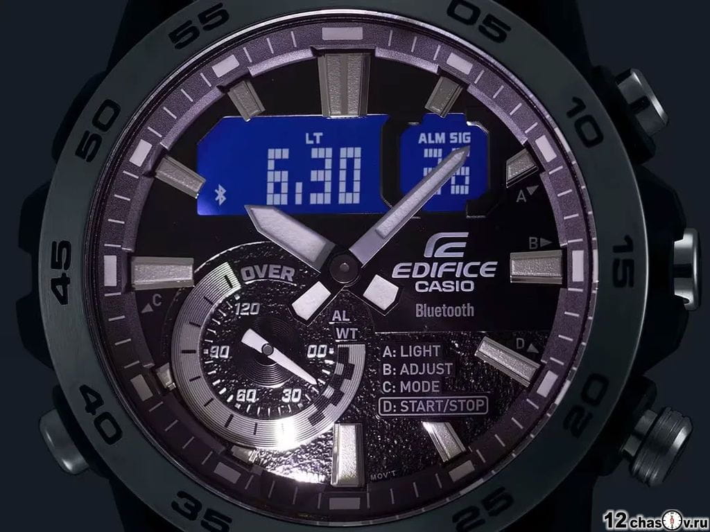 ). Автоматический переход на зимнее и летнее время, возможность включения/отключения данной функции. Переключение между домашним и мировым временем. Беспроводная технология BluetoothBluetoothСовременная технология, позволяющая синхронизировать часы с телефоном и переносить данные. Часы с Bluetooth расширяют возможности вашего смартфона и делают его использование ещё более удобным. со сверхнизким потреблением энергии для синхронизации со смартфоном. При подключении к смартфону часы корректируют текущее время, настраивают будильник, а также копируют настройки мирового времени (до 300 городов). Приложение EDIFICE Connected позволяет вести журнал показаний секундомера и прохождения этапов, вычислять разность между заданным временем и временем этапа. Отображение дней недели на шести языках. Смена отображения даты/месяца. Функции перемещения стрелок, поиска телефона и включения/отключения звука. Включение/выключение звукового сигнала по расписанию.