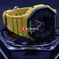 Аксессуар в жёлтом цвете поможет дополнить повседневный образ. Внимание перенимает на себя безельБезельВнешний ободок, закрепляющий стекло. В спортивных часах так называется поворотное кольцо с делениями на циферблате, выполняет роль таймера – замеряет отрезки времени на шкале. Неподвижный безель – элемент декора. Однонаправленно вращающийся безель на дайверских часах позволяет фиксировать моменты погружения и выныривания на поверхность., выполненный в форме октагона. Благодаря конструкции Carbon Core GuardCarbon Core Guard Новейшая структура корпуса, разработанная Casio. Полиуретановая пластина дополнительно усилена карбоновыми вставками, что придаёт специальную защиту от механических повреждений. Карбон отличается лёгкостью и прочностью. для тонкого ударопрочного корпусаУдаропрочный корпусМеханизм заключён в корпус, выполненный из современных материалов, устойчивых к ударам, механическим повреждениям и падению с высоты: инновационный пластик, карбон, нержавеющая сталь, титан. (11,8 мм) часы получили невероятную лёгкость, повышенную устойчивость к падению, повреждениям. Обновлённое крепление полимерного ремешка позволяет менять его в считанные секунды. Японский кварцевый механизм получает энергию от батарейки, рассчитанной на 3 года работы. ЛюминесцентнаяЛюминесцентное покрытиеПозволяет считывать показания времени в темноте. Производители наносят на стрелки, часовые индексы, безель или поверхность циферблата светонакопительный состав, дающий холодное свечение. и светодиодная подсветкаСветодиодная подсветкаСветодиодная или LED-подсветка обеспечивает появление яркого холодного свечения за счёт LED-элементов - маленьких лампочек. Они потребляют минимальное количество энергии, чаще всего можно встретить 1 светодиод, в нижней части циферблата.. Минеральное стекло. Сохранение водонепроницаемости до 10 бар. Будильник, хронографХронографФункция позволяет измерять отрезки времени с особой точностью: часы, минуты, секунды. Верным признаком хронографа является наличие на циферблате 3 дополнительных окошек-счётчиков., таймер, мировое времяМировое время Полезное часовое усложнение, отображающее время в основных городах и известных областях по всему миру, оно связано с часовыми поясами, удобно для путешественников и бизнесменов. , секундомер, вечный календарьВечный календарьКлассическое часовое усложнение, представляющее собой календарь, рассчитанный на несколько лет вперёд (стандартно – до 2099 года). Определяет текущую дату, день недели, месяц.. Габариты: 48,5 x 45,4 x 11,8 мм.