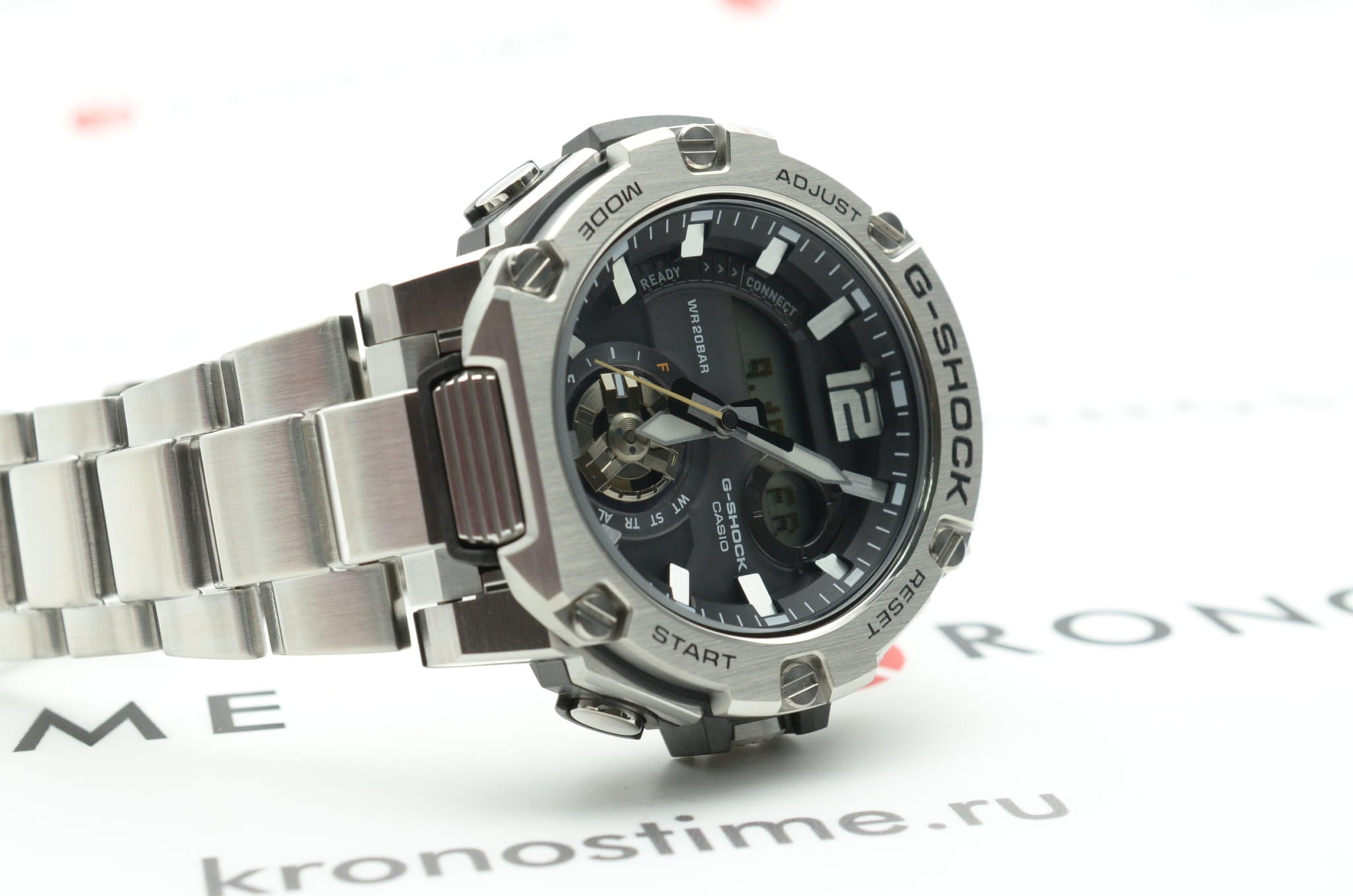 Корпус имеет структуру Carbon Core GuardCarbon Core Guard Новейшая структура корпуса, разработанная Casio. Полиуретановая пластина дополнительно усилена карбоновыми вставками, что придаёт специальную защиту от механических повреждений. Карбон отличается лёгкостью и прочностью., что говорит о повышенной ударопрочности. БезельБезельВнешний ободок, закрепляющий стекло. В спортивных часах так называется поворотное кольцо с делениями на циферблате, выполняет роль таймера – замеряет отрезки времени на шкале. Неподвижный безель – элемент декора. Однонаправленно вращающийся безель на дайверских часах позволяет фиксировать моменты погружения и выныривания на поверхность. и браслет изготовлены из стали 316L. Японский кварцевый механизм отличается высокой точностью хода 15 +/- секунд в месяц. Часы оснащены инновационной технологией , синхронизация со смартфоном происходит с помощью BluetoothBluetoothСовременная технология, позволяющая синхронизировать часы с телефоном и переносить данные. Часы с Bluetooth расширяют возможности вашего смартфона и делают его использование ещё более удобным.. Возможности: двойная автоматическая подсветка, мировое времяМировое время Полезное часовое усложнение, отображающее время в основных городах и известных областях по всему миру, оно связано с часовыми поясами, удобно для путешественников и бизнесменов. , будильник, хронографХронографФункция позволяет измерять отрезки времени с особой точностью: часы, минуты, секунды. Верным признаком хронографа является наличие на циферблате 3 дополнительных окошек-счётчиков., календарь, таймер.