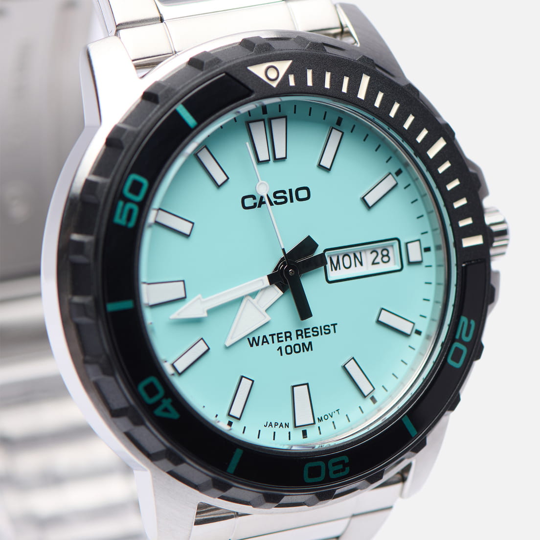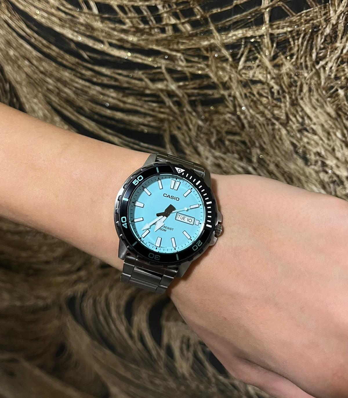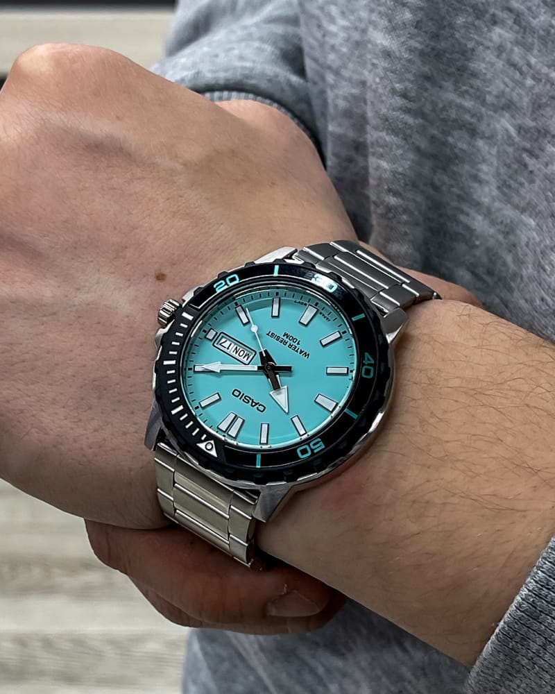 Casio MTD-125D-2A2 – стильные мужские часы, идеально подходящие для активного образа жизни. Корпус диаметром 46,5 × 45,6 × 10,4 мм выполнен из нержавеющей стали, что гарантирует прочность и долговечность. Бирюзовый циферблат защищён минеральным стекломМинеральное стеклоМинеральное стекло представляет собой искусственно выращенный минерал кварца. Такое стекло отличается особой устойчивостью к повреждениям и царапинам. Уступает по некоторым качествам сапфировому стеклу., устойчивым к царапинам и механическим повреждениям. Часы оснащены кварцевым механизмом с высокой точностью хода и функцией отображения дня недели и даты, где день недели доступен на английском и испанском языках. Браслет из нержавеющей стали дополнен раскладной застёжкойРаскладная застёжкаТакой тип застёжки используется только на браслетах из металла. Она никогда не раскрывается полностью, происходит разделение на 2 и более частей. Раскладывающая застёжка снизит вероятность потери часов к минимуму., обеспечивающей удобную фиксацию на запястье. Водонепроницаемость 10 бар (100 метров) делает модель надёжным спутником для плавания и других водных активностей.