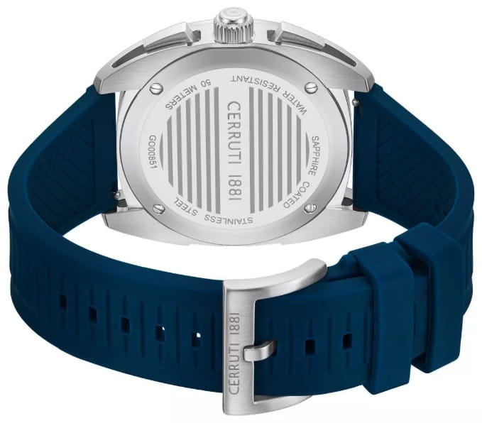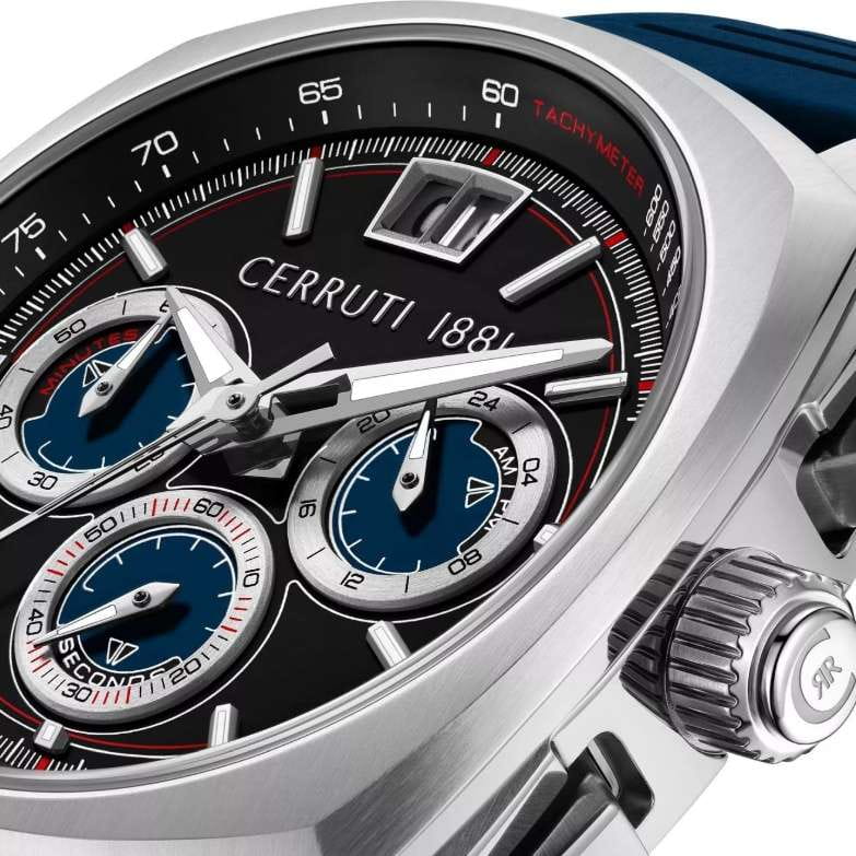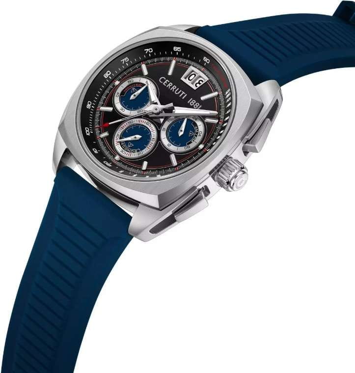 Мужские кварцевые часы Cerruti 1881 Cuneo CIWGO0085105 — спортивный аксессуар с французским дизайном и расширенным функционалом. Корпус из нержавеющей стали 316L, размером 41.3 мм. Циферблат — чёрный с синими элементами, с штриховыми метками и окошком даты в положении 12 часов. Стекло — минеральноеМинеральное стеклоМинеральное стекло представляет собой искусственно выращенный минерал кварца. Такое стекло отличается особой устойчивостью к повреждениям и царапинам. Уступает по некоторым качествам сапфировому стеклу. с сапфировым покрытием. Стрелки и метки с люминесцентным покрытиемЛюминесцентное покрытиеПозволяет считывать показания времени в темноте. Производители наносят на стрелки, часовые индексы, безель или поверхность циферблата светонакопительный состав, дающий холодное свечение.. Функции: хронографХронографФункция позволяет измерять отрезки времени с особой точностью: часы, минуты, секунды. Верным признаком хронографа является наличие на циферблате 3 дополнительных окошек-счётчиков., тахиметрТахиметрРазмеченная шкала, располагается на ободке или безеле часов. Тахиметр позволяет рассчитать скорость на определённом участке пути, расстояние измеряется в километрах или милях., секундомер. Ремешок — синий силиконовый на стандартной застёжке. Водонепроницаемость 100 м. Идеальный выбор для тех, кто ценит французский дизайн и спортивный стиль.