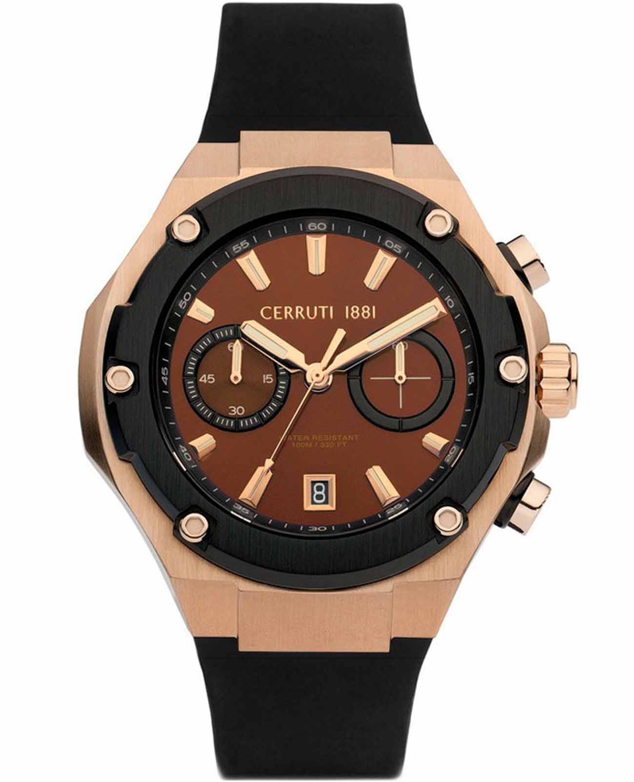 Мужские часы-хронографХронографФункция позволяет измерять отрезки времени с особой точностью: часы, минуты, секунды. Верным признаком хронографа является наличие на циферблате 3 дополнительных окошек-счётчиков. с секундомеромСекундомерСекундоме́р — прибор, способный измерять интервалы времени с точностью до долей секунды. Cerruti 1881 Lucardo CIWGO2206102 — это воплощение элегантности и современного стиля, сочетающее в себе передовые технологии и изысканный дизайн. Оснащенные кварцевым механизмом, эти часы обеспечивают высокую точность хода, что особенно важно для тех, кто ценит надежность и пунктуальность. Минеральное стеклоМинеральное стеклоМинеральное стекло представляет собой искусственно выращенный минерал кварца. Такое стекло отличается особой устойчивостью к повреждениям и царапинам. Уступает по некоторым качествам сапфировому стеклу. защищает циферблат от мелких механических повреждений, сохраняя его первоначальный блеск и ясность на протяжении долгого времени. Корпус часов изготовлен из качественной стали с золотистый IP-покрытиемIP-покрытиеМетод ионного напыления. Демонстрирует повышенную устойчивость к истиранию, окислению и химическим веществам. Под воздействием высокого давления и температуры около 1500°C молекулы металла надёжно соединяются с частицами корпуса часов., что придаёт конструкции прочность и устойчивость к внешним воздействиям. Особого внимания заслуживает безельБезельВнешний ободок, закрепляющий стекло. В спортивных часах так называется поворотное кольцо с делениями на циферблате, выполняет роль таймера – замеряет отрезки времени на шкале. Неподвижный безель – элемент декора. Однонаправленно вращающийся безель на дайверских часах позволяет фиксировать моменты погружения и выныривания на поверхность. с черным IP-покрытиемIP-покрытиеМетод ионного напыления. Демонстрирует повышенную устойчивость к истиранию, окислению и химическим веществам. Под воздействием высокого давления и температуры около 1500°C молекулы металла надёжно соединяются с частицами корпуса часов., который не только защищает часы, но и добавляет им изысканный вид. На циферблате расположены два дополнительных индикатора, которые делают функциональность часов ещё более широкой и удобной. Окошко даты, находящееся в положении 6 часов, обеспечивает дополнительное удобство, позволяя быстро и легко определить текущую дату. Стрелки и метки с люминесцентным покрытиемЛюминесцентное покрытиеПозволяет считывать показания времени в темноте. Производители наносят на стрелки, часовые индексы, безель или поверхность циферблата светонакопительный состав, дающий холодное свечение. обеспечивают отличную видимость даже в условиях недостаточного освещения. Класс водозащиты 100 метров позволяет владельцу не только плавать, но и нырять, а также заниматься другими водными видами спорта, не беспокоясь о сохранности часов. Силиконовый ремешок, оснащенный застёжкой-бабочкой с кнопкамиЗастёжка "бабочка"Такой вид застёжки дополняется предохранителями, помогающими избежать случайного раскрытия браслета. Обладают изящным исполнением. , обеспечивает надежную фиксацию на запястье и добавляет комфорта при носке, делая эти часы идеальными для активного образа жизни.