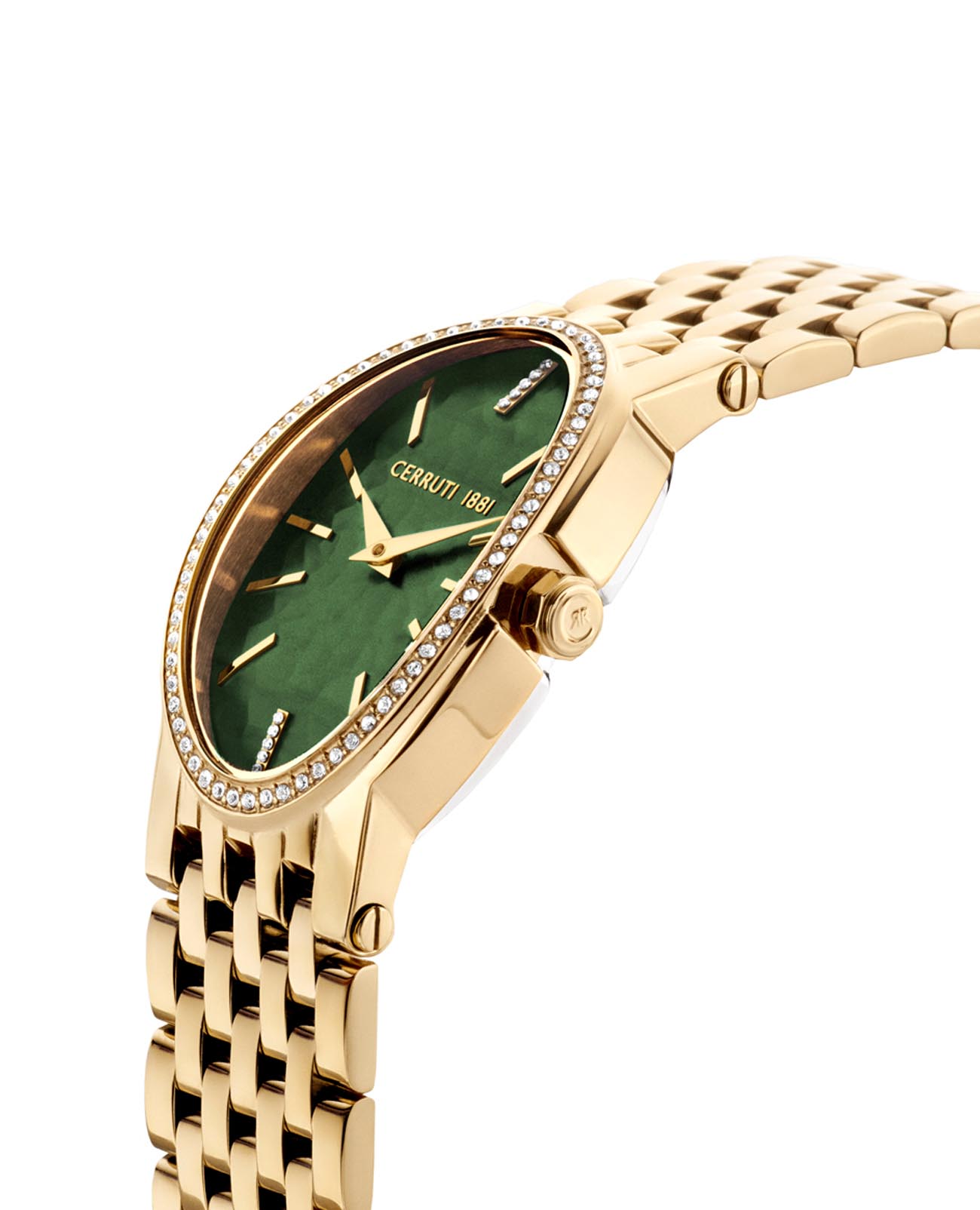 Французские женские часы с кристаллами Cerruti 1881 Norcia CIWLG0008804, кварцевый механизм с высокой точностью. Минеральное стеклоМинеральное стеклоМинеральное стекло представляет собой искусственно выращенный минерал кварца. Такое стекло отличается особой устойчивостью к повреждениям и царапинам. Уступает по некоторым качествам сапфировому стеклу. устойчивое к мелким механическим повреждениям. Корпус часов изготовлен из стали с IP-покрытиемIP-покрытиеМетод ионного напыления. Демонстрирует повышенную устойчивость к истиранию, окислению и химическим веществам. Под воздействием высокого давления и температуры около 1500°C молекулы металла надёжно соединяются с частицами корпуса часов.. БезельБезельВнешний ободок, закрепляющий стекло. В спортивных часах так называется поворотное кольцо с делениями на циферблате, выполняет роль таймера – замеряет отрезки времени на шкале. Неподвижный безель – элемент декора. Однонаправленно вращающийся безель на дайверских часах позволяет фиксировать моменты погружения и выныривания на поверхность. и циферблат украшены кристаллами. Класс водозащиты: 30 метров, позволит защитить корпус от случайных брызг или капель дождя. Стальной браслет с IP-покрытиемIP-покрытиеМетод ионного напыления. Демонстрирует повышенную устойчивость к истиранию, окислению и химическим веществам. Под воздействием высокого давления и температуры около 1500°C молекулы металла надёжно соединяются с частицами корпуса часов. на застёжке-бабочке с кнопкамиЗастёжка "бабочка"Такой вид застёжки дополняется предохранителями, помогающими избежать случайного раскрытия браслета. Обладают изящным исполнением. .