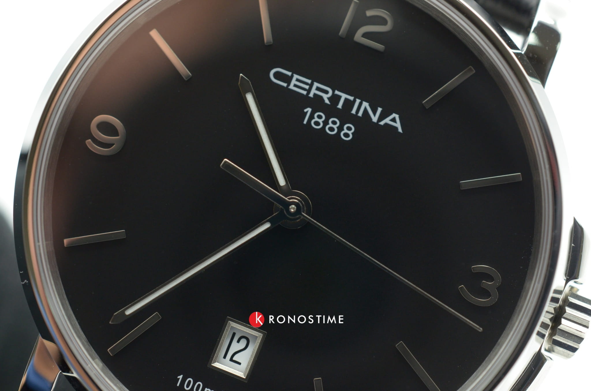 Брендовый аксессуар в чёрной цветовой гамме отличается безупречным качеством ввиду применения надёжных современных материалов: стекло из сапфира, устойчивое к появлению царапин, натуральная кожа для изготовления ремешка, прочный корпус из хирургической стали 316L. Швейцарский кварцевый калибр ETA F06.111 обеспечивает абсолютную точность показаний. Сохранение водонепроницаемости до 10 бар. Система DS ConceptDS ConceptDouble Security Concept, обозначает двойную надёжность и безупречную точность часов Certina. Двойная система защиты подразумевает обеспечение максимальной устойчивости к ударам и высоких показателей водонепроницаемости.. Отображение текущего числа, функция EOLEOLПредставляет собой систему, уведомляющую владельца часов о необходимости замены элемента питания. За 2 недели до полного разряда батарейки секундная стрелка перестаёт ходить чётко и начинает перепрыгивать на 3-4 деления.. Диаметр корпуса: 38 мм.