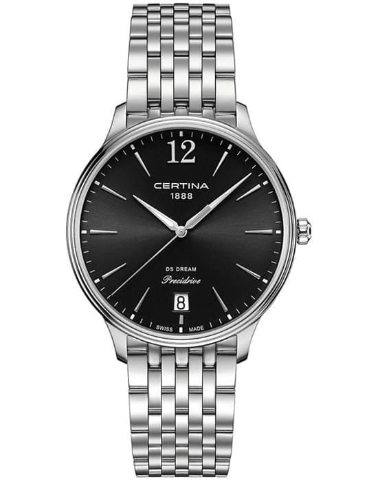 Модель станет неотъемлемой деталью образа, придаст ему завершенность. Наручные часы с чёрным циферблатом отражают собой классический стиль, что позволяет им стать универсальным вариантом на торжественный вечер, прогулку, деловую встречу. Высокая точность хода обеспечивается швейцарским кварцевым механизмом ETA F07.411 Precidrive™Precidrive™Инновационный кварцевый механизм Certina. Часы, оснащённые этим швейцарским калибром, приравниваются к точности к сертифицированным хронометрам, точность хода составляет +/-10 секунд в год.. Сапфировое стекло с антибликовым покрытием. Концепция Двойной Надёжности DS ConceptDS ConceptDouble Security Concept, обозначает двойную надёжность и безупречную точность часов Certina. Двойная система защиты подразумевает обеспечение максимальной устойчивости к ударам и высоких показателей водонепроницаемости.. Водостойкость 100 метров. Люминесцентная подсветкаЛюминесцентное покрытиеПозволяет считывать показания времени в темноте. Производители наносят на стрелки, часовые индексы, безель или поверхность циферблата светонакопительный состав, дающий холодное свечение. стрелок. Корпус и браслет из нержавеющей стали 316L. Безопасная . Прямоугольная апертура даты, индикатор EOLEOLПредставляет собой систему, уведомляющую владельца часов о необходимости замены элемента питания. За 2 недели до полного разряда батарейки секундная стрелка перестаёт ходить чётко и начинает перепрыгивать на 3-4 деления.. Диаметр корпуса: 38 мм.