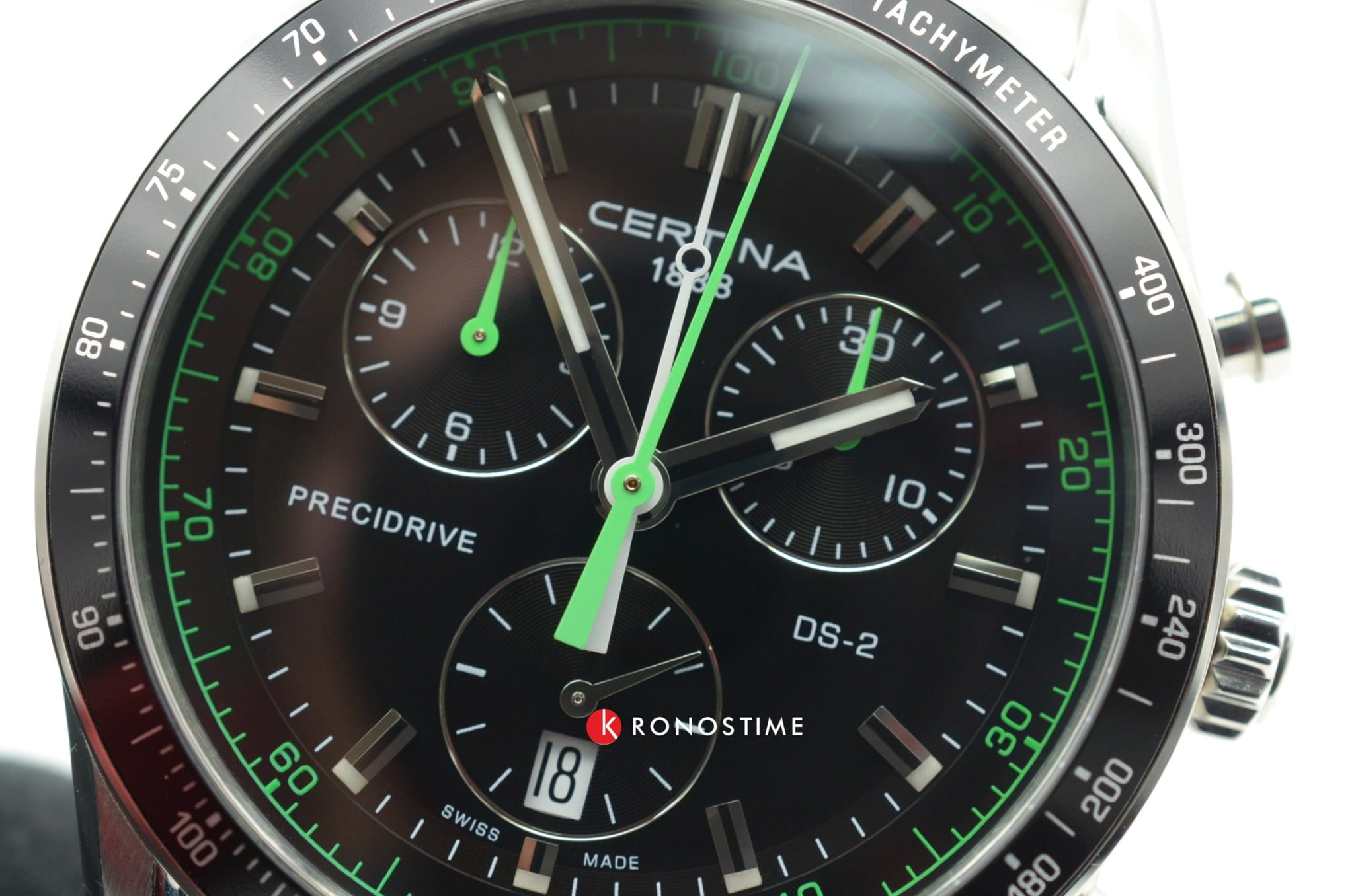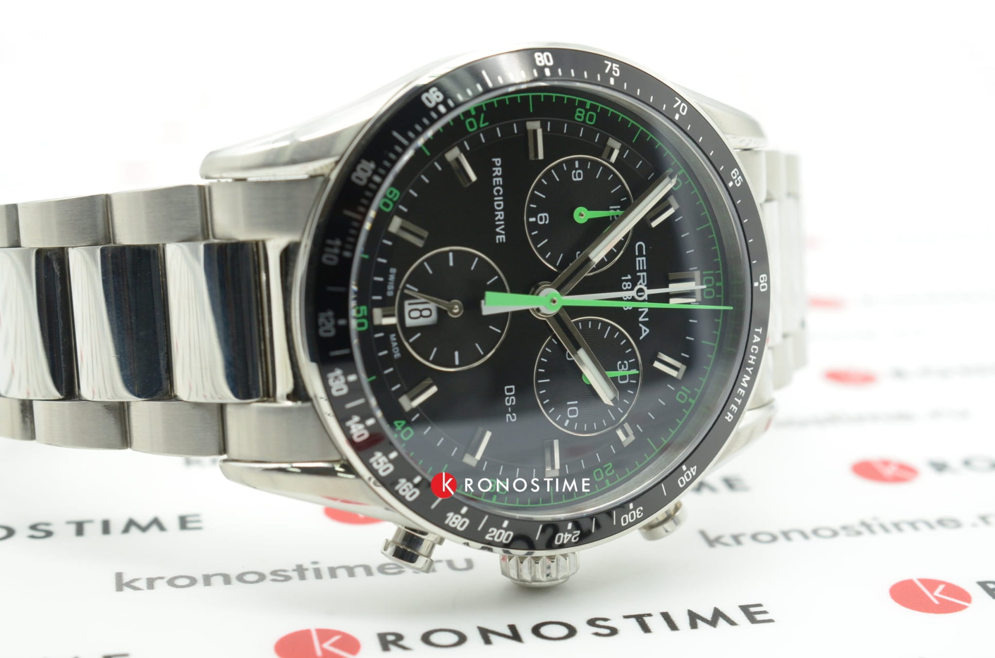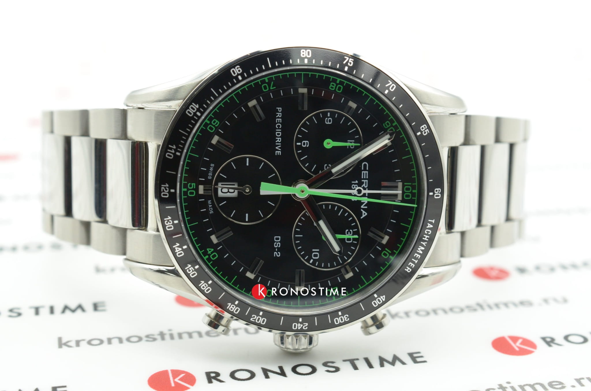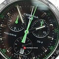 Брендовый аксессуар сразу притягивает внимание. Чёрный циферблат, дополненный зелёными элементами и функциональными окошками, отражает спортивную динамичность. Алюминиевый безельБезельВнешний ободок, закрепляющий стекло. В спортивных часах так называется поворотное кольцо с делениями на циферблате, выполняет роль таймера – замеряет отрезки времени на шкале. Неподвижный безель – элемент декора. Однонаправленно вращающийся безель на дайверских часах позволяет фиксировать моменты погружения и выныривания на поверхность. размечен шкалой тахиметраТахиметрРазмеченная шкала, располагается на ободке или безеле часов. Тахиметр позволяет рассчитать скорость на определённом участке пути, расстояние измеряется в километрах или милях.. Часы основаны на концепции Double SecurityDS ConceptDouble Security Concept, обозначает двойную надёжность и безупречную точность часов Certina. Двойная система защиты подразумевает обеспечение максимальной устойчивости к ударам и высоких показателей водонепроницаемости., что свидетельствует о высокой устойчивости к ударам и водонепроницаемости (до 10 бар) модели. Швейцарский кварцевый калибр ETA 251.264 Precidrive™Precidrive™Инновационный кварцевый механизм Certina. Часы, оснащённые этим швейцарским калибром, приравниваются к точности к сертифицированным хронометрам, точность хода составляет +/-10 секунд в год., измеряющий время с точностьюдо одной сотой секунды. Двухстороннее антибликовое покрытие для стекла из сапфира. Корпус и браслет из стали 316L с антикоррозионными свойствами. Задняя крышка с фирменной гравировкой. ХронографХронографФункция позволяет измерять отрезки времени с особой точностью: часы, минуты, секунды. Верным признаком хронографа является наличие на циферблате 3 дополнительных окошек-счётчиков., календарь, индикатор EOLEOLПредставляет собой систему, уведомляющую владельца часов о необходимости замены элемента питания. За 2 недели до полного разряда батарейки секундная стрелка перестаёт ходить чётко и начинает перепрыгивать на 3-4 деления., секундомер. Диаметр корпуса: 41 мм.