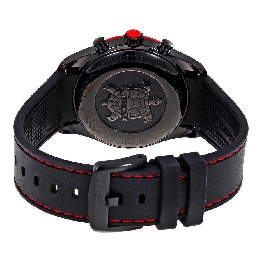 Аксессуар с красными деталями оснащён усложнениями: тахиметрТахиметрРазмеченная шкала, располагается на ободке или безеле часов. Тахиметр позволяет рассчитать скорость на определённом участке пути, расстояние измеряется в километрах или милях., секундомер, календарь, хронографХронографФункция позволяет измерять отрезки времени с особой точностью: часы, минуты, секунды. Верным признаком хронографа является наличие на циферблате 3 дополнительных окошек-счётчиков.. За высокую точность хода отвечает швейцарский кварцевый калибр ETA 251.264 Precidrive™Precidrive™Инновационный кварцевый механизм Certina. Часы, оснащённые этим швейцарским калибром, приравниваются к точности к сертифицированным хронометрам, точность хода составляет +/-10 секунд в год.. Часы основаны на концепции Двойной Надёжности DS ConceptDS ConceptDouble Security Concept, обозначает двойную надёжность и безупречную точность часов Certina. Двойная система защиты подразумевает обеспечение максимальной устойчивости к ударам и высоких показателей водонепроницаемости..