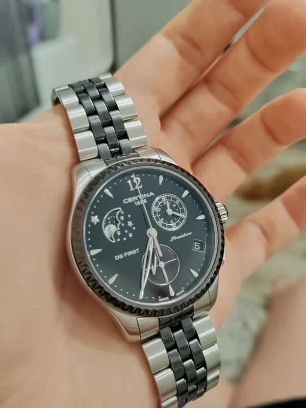 Окошко на позиции 10 часов отображает лунные фазы, стильно смотрится бриллиантовая звезда. Кварцевый швейцарский механизм G10.962 Precidrive™Precidrive™Инновационный кварцевый механизм Certina. Часы, оснащённые этим швейцарским калибром, приравниваются к точности к сертифицированным хронометрам, точность хода составляет +/-10 секунд в год.. БезельБезельВнешний ободок, закрепляющий стекло. В спортивных часах так называется поворотное кольцо с делениями на циферблате, выполняет роль таймера – замеряет отрезки времени на шкале. Неподвижный безель – элемент декора. Однонаправленно вращающийся безель на дайверских часах позволяет фиксировать моменты погружения и выныривания на поверхность. и вставки для браслета из керамики. EOLEOLПредставляет собой систему, уведомляющую владельца часов о необходимости замены элемента питания. За 2 недели до полного разряда батарейки секундная стрелка перестаёт ходить чётко и начинает перепрыгивать на 3-4 деления., календарь, хронографХронографФункция позволяет измерять отрезки времени с особой точностью: часы, минуты, секунды. Верным признаком хронографа является наличие на циферблате 3 дополнительных окошек-счётчиков..
