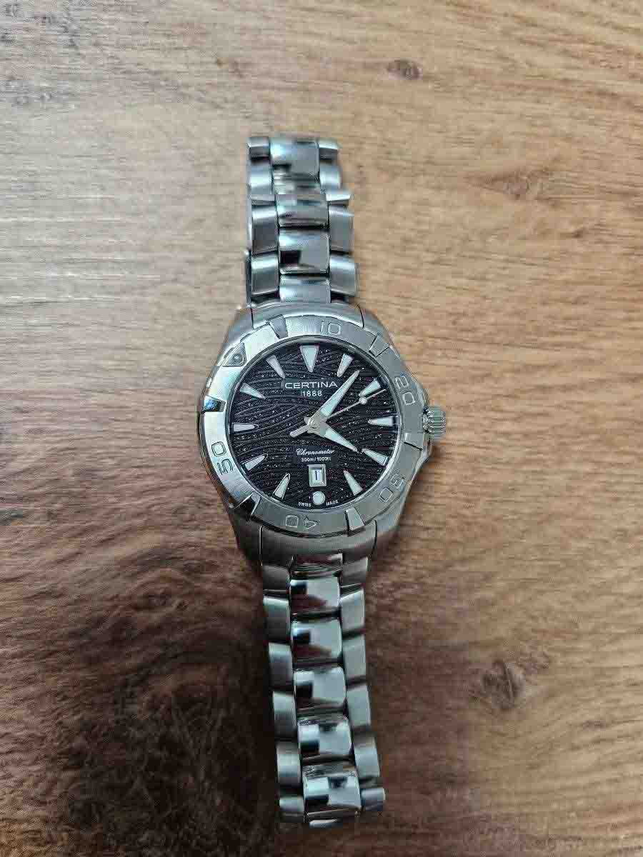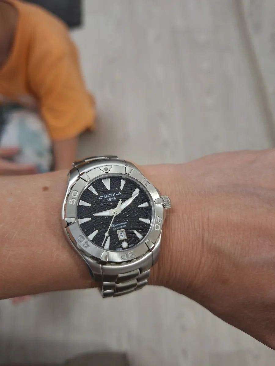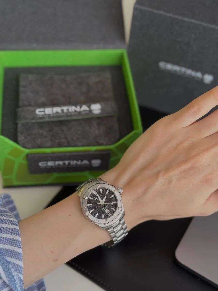Компактный циферблат дополнен необычным узором в виде волн с блестящими акцентами, что стало выражением любви бренда Certina к морской стихии. Изящный аксессуар внутри просто «кремень», чему способствует система DS ConceptDS ConceptDouble Security Concept, обозначает двойную надёжность и безупречную точность часов Certina. Двойная система защиты подразумевает обеспечение максимальной устойчивости к ударам и высоких показателей водонепроницаемости.: водонепроницаемость 300 метров, завинчивающаяся задняя крышка и заводная головка с системой блокировки, сапфировое стекло, хирургическая сталь 316L. Швейцарский кварцевый механизм ETA F04.411 Precidrive™Precidrive™Инновационный кварцевый механизм Certina. Часы, оснащённые этим швейцарским калибром, приравниваются к точности к сертифицированным хронометрам, точность хода составляет +/-10 секунд в год. отмечен сертификатом хронометра COSCСертификат COSCОфициальный сертификат, подтверждающий то, что часы ходят с особо высокой точностью. Для получения документа часы подвергаются тестовым испытаниям, разработанным швейцарским институтом тестирования хронометров COSC. Допустимая норма для механических часов -4/+6 секунд в день, для кварцевых моделей +/- 0,07 секунд в день. за безупречную точность хода. Вращающийся безельБезельВнешний ободок, закрепляющий стекло. В спортивных часах так называется поворотное кольцо с делениями на циферблате, выполняет роль таймера – замеряет отрезки времени на шкале. Неподвижный безель – элемент декора. Однонаправленно вращающийся безель на дайверских часах позволяет фиксировать моменты погружения и выныривания на поверхность.. Яркая люминесцентная подсветкаЛюминесцентное покрытиеПозволяет считывать показания времени в темноте. Производители наносят на стрелки, часовые индексы, безель или поверхность циферблата светонакопительный состав, дающий холодное свечение.. Апертура даты, функция EOLEOLПредставляет собой систему, уведомляющую владельца часов о необходимости замены элемента питания. За 2 недели до полного разряда батарейки секундная стрелка перестаёт ходить чётко и начинает перепрыгивать на 3-4 деления.. Диаметр корпуса: 34 мм.