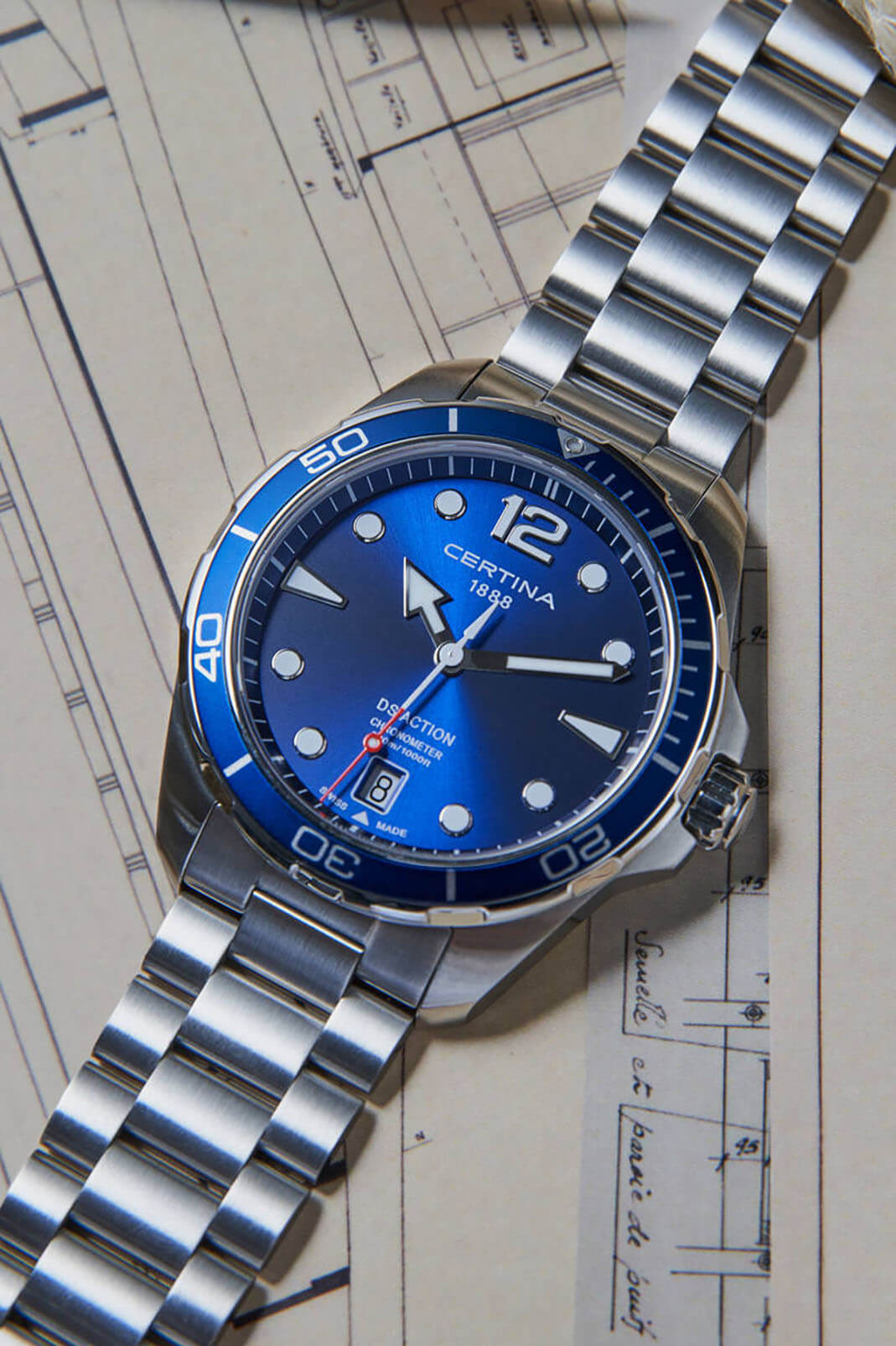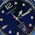 Брендовый аксессуар с насыщенно-синим циферблатом - идеальное дополнение как к деловому, так и к повседневному стилю. Модель отличается предельной точностью швейцарского кварцевого механизма ETA F07.412 Precidrive™Precidrive™Инновационный кварцевый механизм Certina. Часы, оснащённые этим швейцарским калибром, приравниваются к точности к сертифицированным хронометрам, точность хода составляет +/-10 секунд в год., что подтверждается официальным сертификатом COSCСертификат COSCОфициальный сертификат, подтверждающий то, что часы ходят с особо высокой точностью. Для получения документа часы подвергаются тестовым испытаниям, разработанным швейцарским институтом тестирования хронометров COSC. Допустимая норма для механических часов -4/+6 секунд в день, для кварцевых моделей +/- 0,07 секунд в день.. Высокое качество проявляет себя невооружённым глазом: стальной ударопрочный корпусУдаропрочный корпусМеханизм заключён в корпус, выполненный из современных материалов, устойчивых к ударам, механическим повреждениям и падению с высоты: инновационный пластик, карбон, нержавеющая сталь, титан., водонепроницаемость до 30 бар, сапфировое стекло, устойчивое к образованию царапин, реализация фирменной разработки DS Concept DS ConceptDouble Security Concept, обозначает двойную надёжность и безупречную точность часов Certina. Двойная система защиты подразумевает обеспечение максимальной устойчивости к ударам и высоких показателей водонепроницаемости.. Завинчивающаяся заводная головка с защитой. Закручивающиеся кнопки и задняя крышка. Одностороннее антибликовое покрытие для стекла. Вращающийся безельБезельВнешний ободок, закрепляющий стекло. В спортивных часах так называется поворотное кольцо с делениями на циферблате, выполняет роль таймера – замеряет отрезки времени на шкале. Неподвижный безель – элемент декора. Однонаправленно вращающийся безель на дайверских часах позволяет фиксировать моменты погружения и выныривания на поверхность. из синего алюминия. Отображение текущего числа. Индикатор EOLEOLПредставляет собой систему, уведомляющую владельца часов о необходимости замены элемента питания. За 2 недели до полного разряда батарейки секундная стрелка перестаёт ходить чётко и начинает перепрыгивать на 3-4 деления.. Дайверская застёжка с фиксатором и специальным удлинениемУдлинение для дайверовЗастёжка с удлинением для дайверов представляет собой безопасное крепление, которое позволяет надевать часы поверх гидрокостюма. Гибкая застёжка удлиняется на 1-2 миллиметра.. Диаметр корпуса: 43 мм.